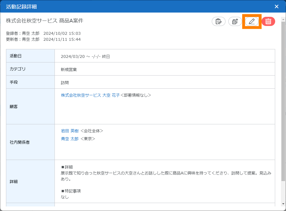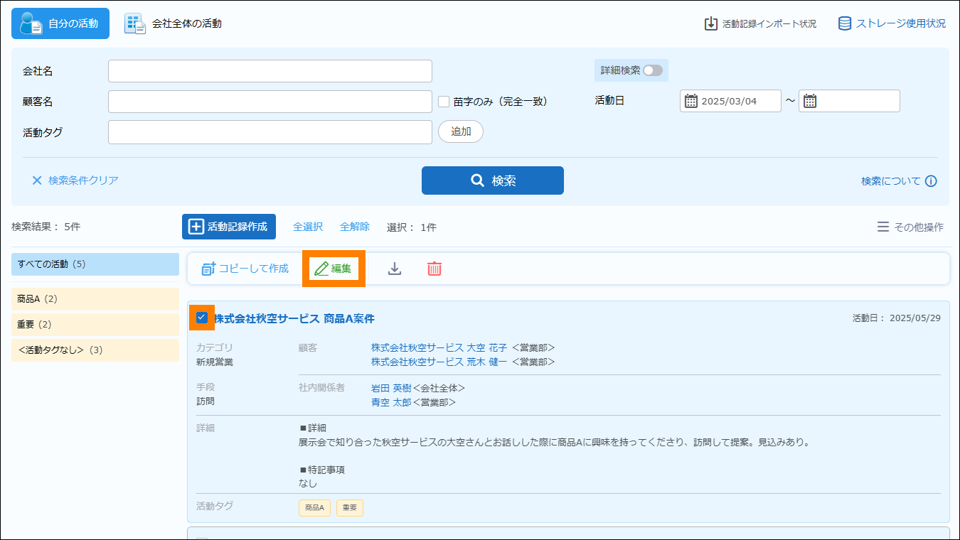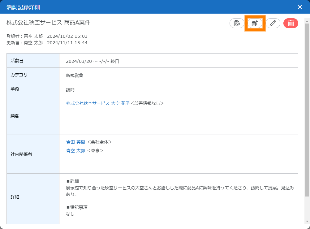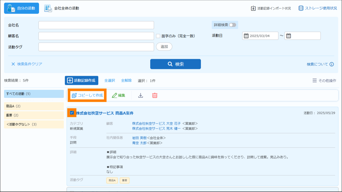 さらに、活動記録は、案件管理にも活用できます。案件の進捗や状況の変化があった場合には、活動記録を編集したり、活動記録をコピーして新しく登録したりできます。