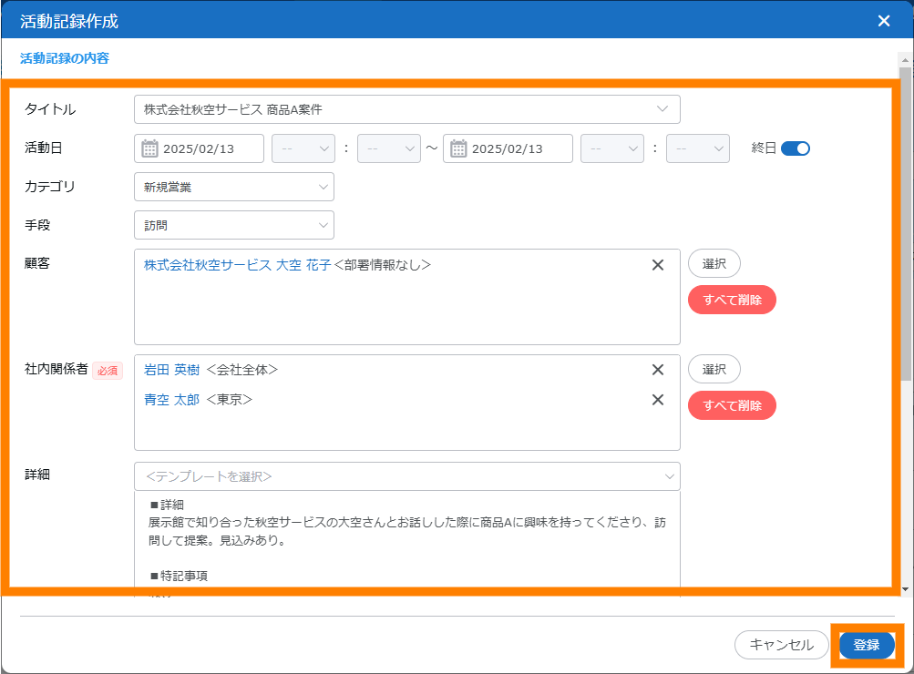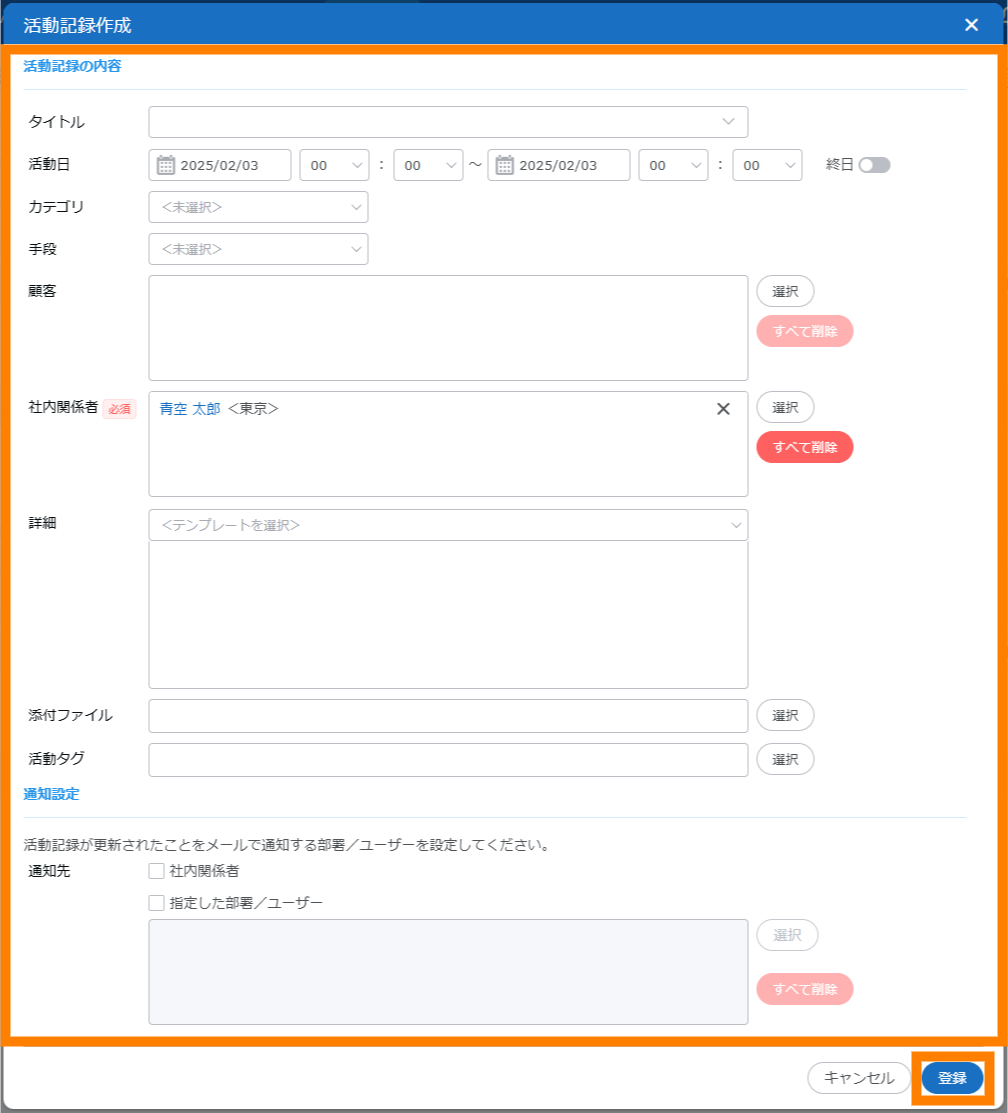 活動記録を新規登録します。「タイトル」「活動日」「カテゴリ」「手段」「顧客」などの情報を登録できます。