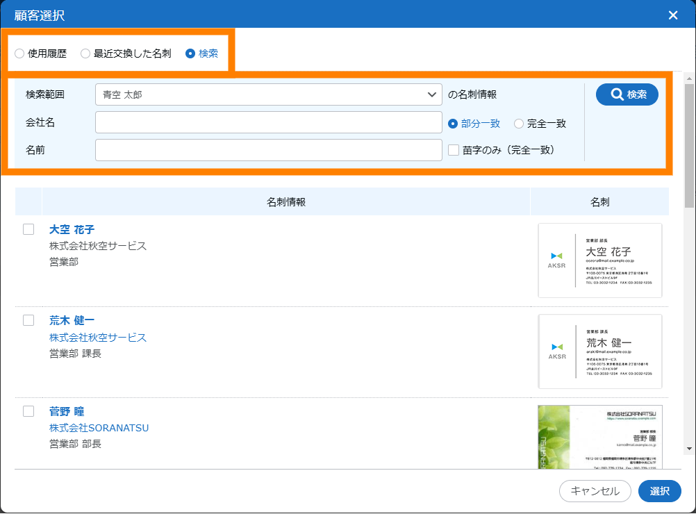 | 顧客 | 顧客が表示されます。氏名をクリックすると、「名刺詳細」画面が表示されます。 | |