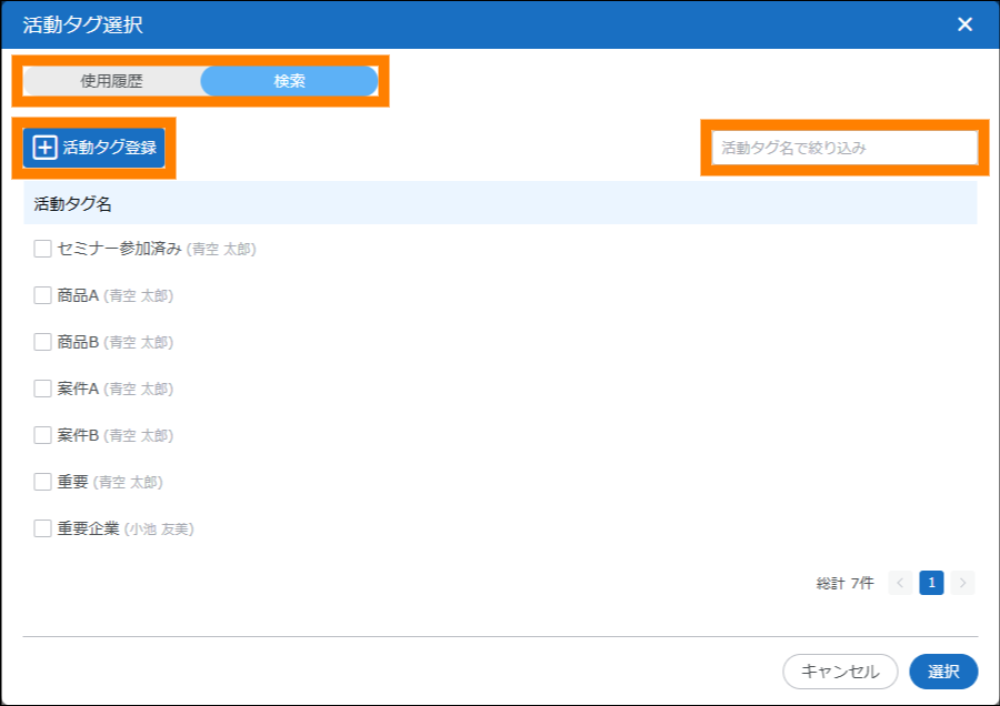 - 活動タグ名で絞り込む場合は、「活動タグ名で絞り込み」にキーワードを入力してください。