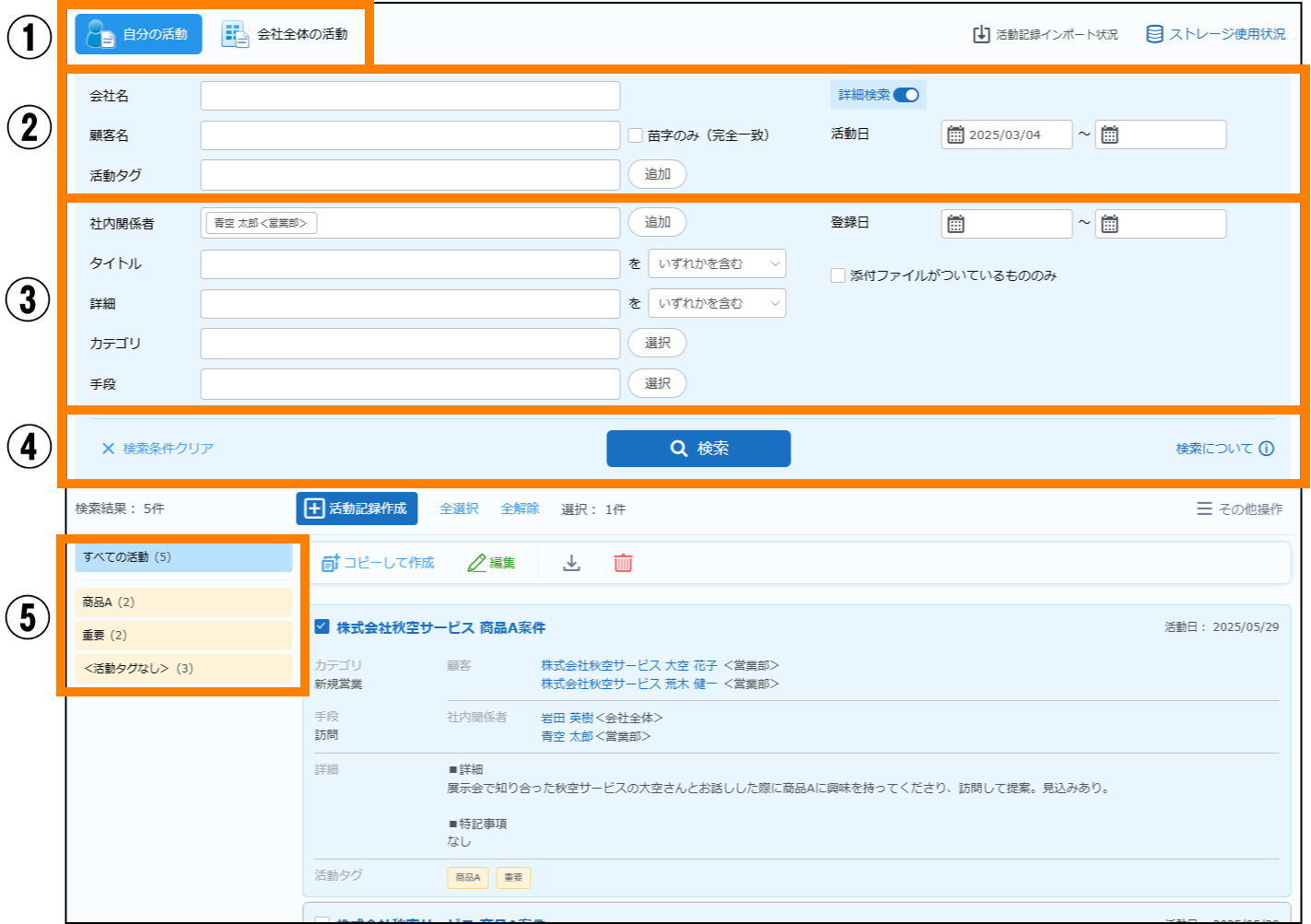 | ① | 自分の活動 | クリックすると、社内関係者に自分(ログインしたユーザー)が設定されている活動記録のみが表示されます。 | |