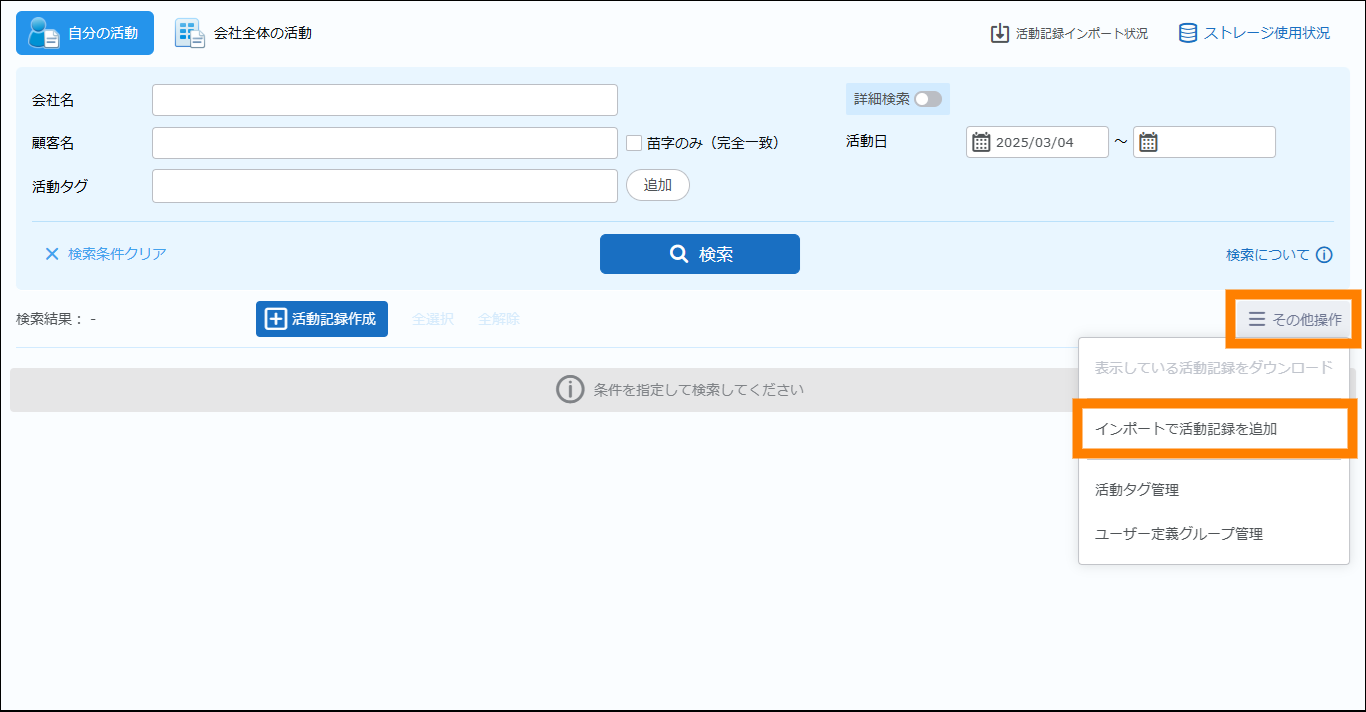 - 活動記録の検索については、「3.5.1. 活動記録を検索・閲覧する」を参照してください。