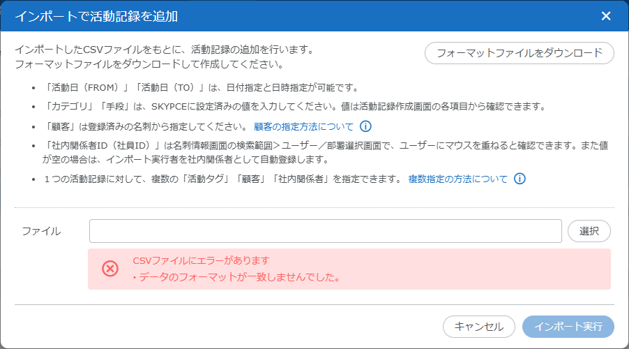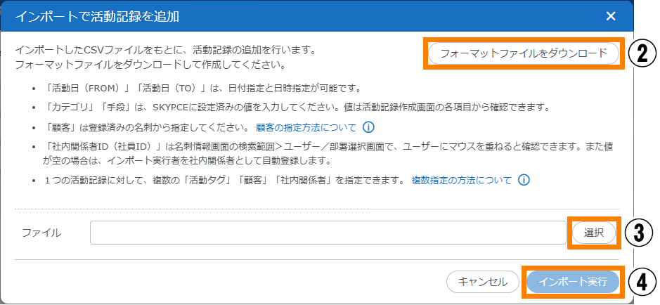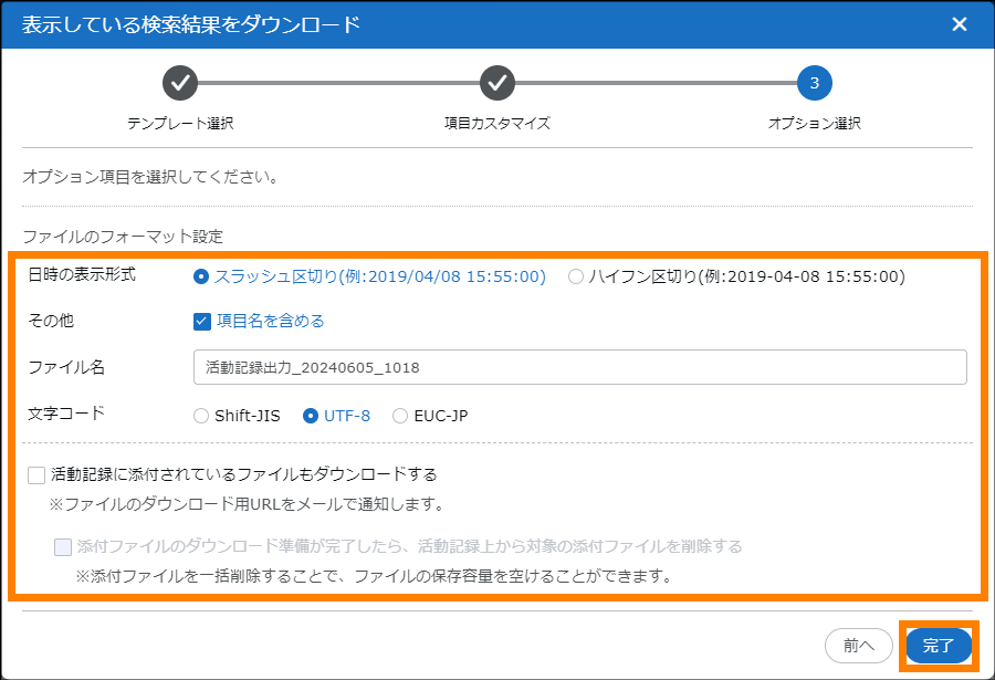 | 活動記録に添付されているファイルもダウンロードする | 活動記録に添付されているファイルもダウンロードする場合はチェックを入れてください。