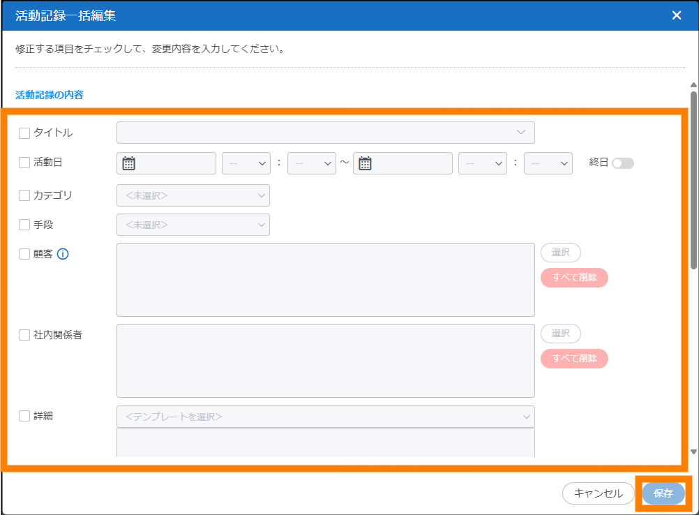 | ③ | 詳細 | 活動に関する詳細情報を入力します。管理者によってテンプレートが設定されている場合は、テンプレートを選択して入力することもできます。 例 : 活動の目的や詳細、メモ、特記事項 |