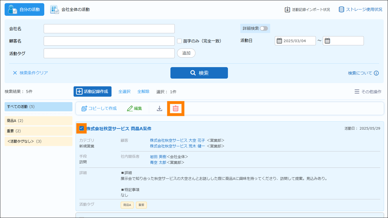 任意の活動記録を選択し、削除します。複数の活動記録をまとめて削除することもできます。