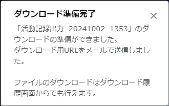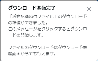 - 削除する活動記録にファイルが添付されている場合、添付ファイルをダウンロードできます。ダウンロードの準備ができると画面にメッセージが表示され、メッセージをクリックするとダウンロードが開始されます。