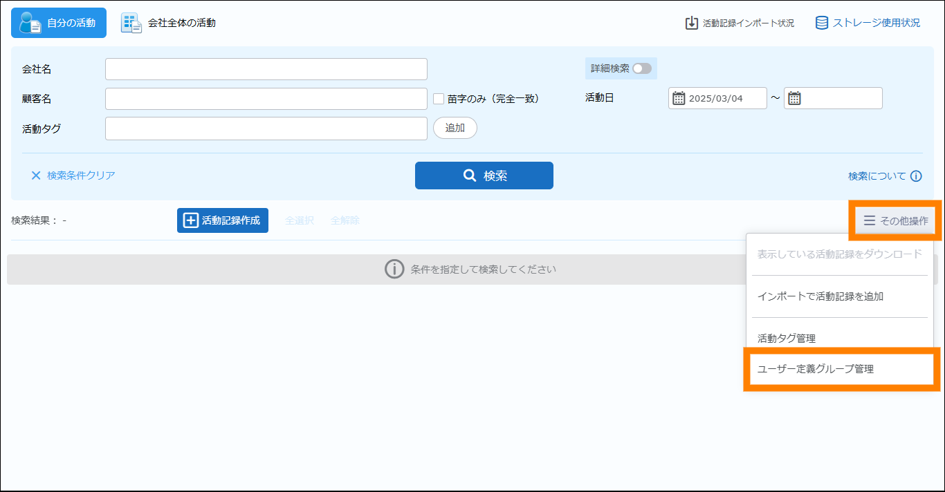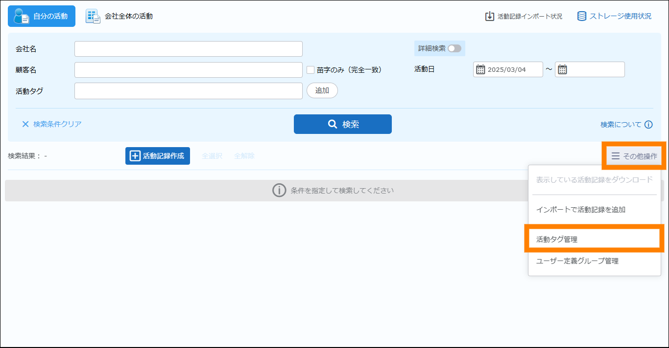 | 活動日 | 活動日を条件に追加できます。日付(期間)で指定してください。検索を実施する日の3か月前~の期間が初期値として表示されます。 | ||