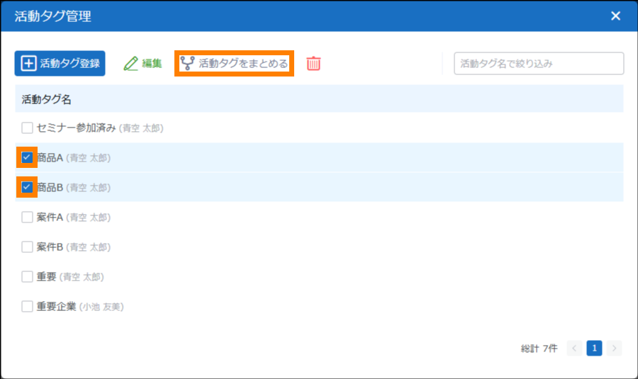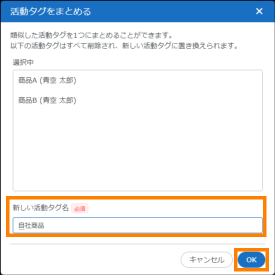 複数の活動タグを1つにまとめます。まとめられた活動タグは削除され、新しい活動タグに置き換えられます。