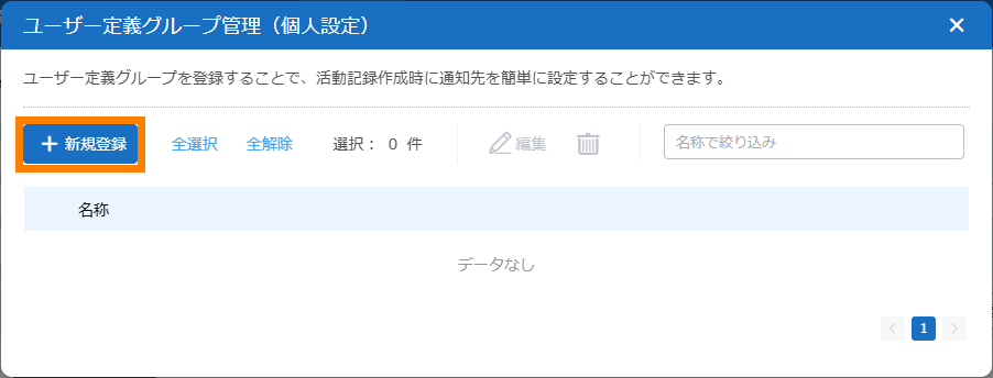 ユーザー定義グループを新規登録します。ユーザー定義グループとは、活動記録の通知先となる部署およびユーザーをグループ化したものです。登録済みのユーザー定義グループを編集、削除することもできます。
