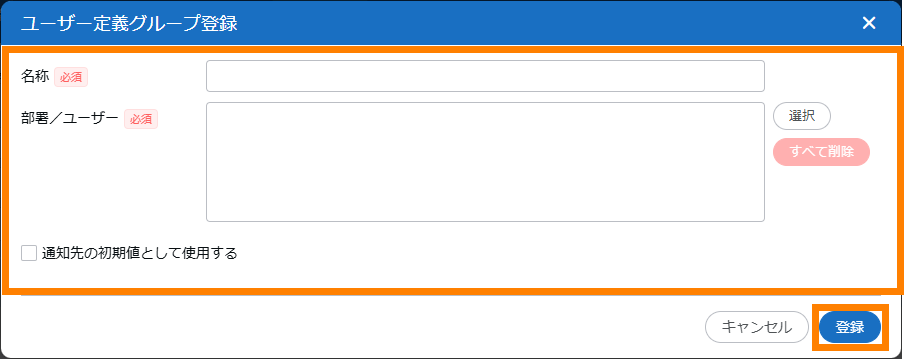- 「通知先の初期値として使用する」にチェックを入れると、活動記録を新規登録したり一括で編集するときに、ここで登録したユーザー定義グループが「通知設定」に初期値として設定されます。