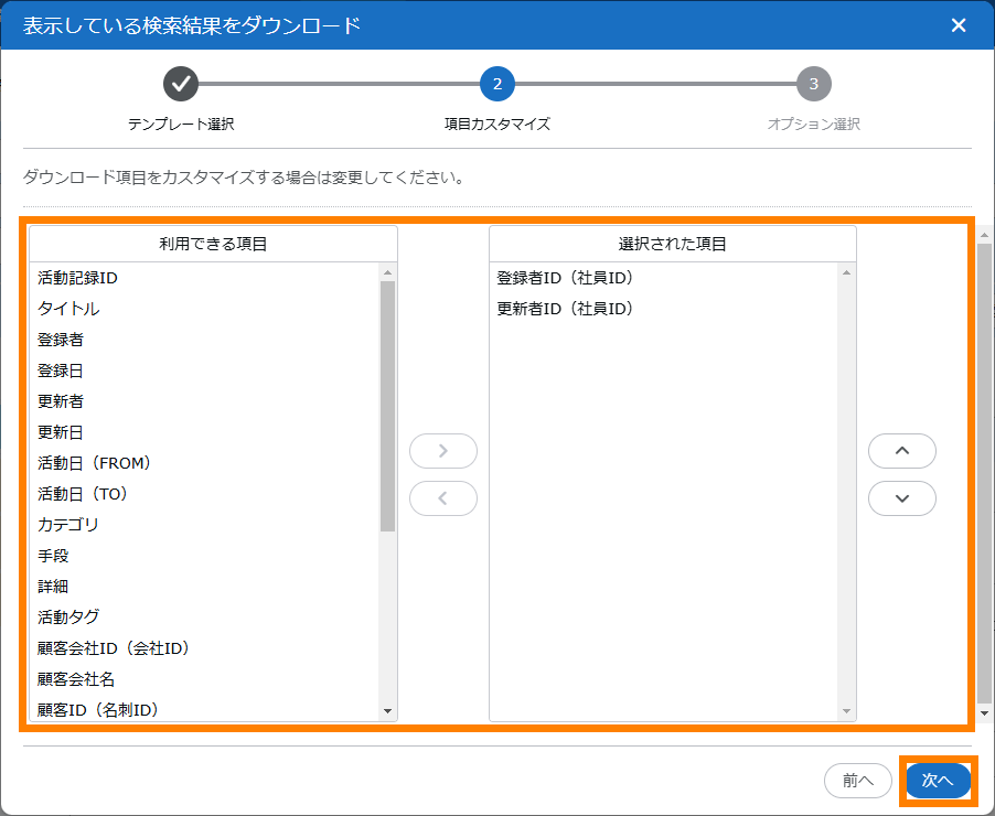 活動記録を一括でダウンロードします。ダウンロードする項目は選択できるので、不要な情報は省くこともできます。また、テンプレートを使ってダウンロードする項目の初期状態を設定することもできます。