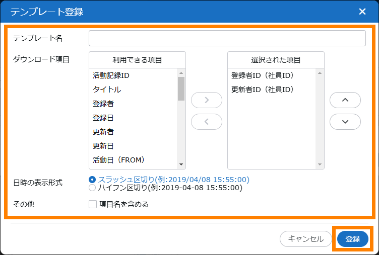 - テンプレートの新規登録、編集、および削除については、「3.5.6.1. 活動記録ダウンロードのテンプレートを管理する」を参照してください。