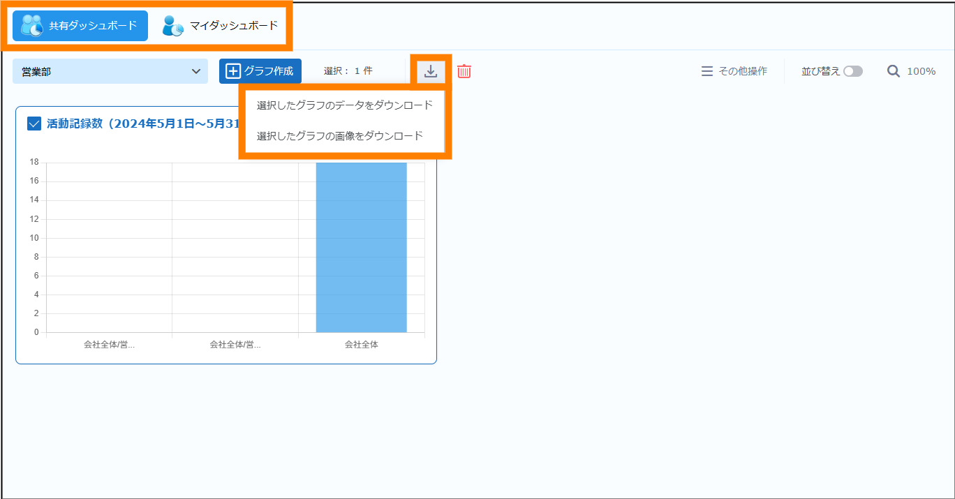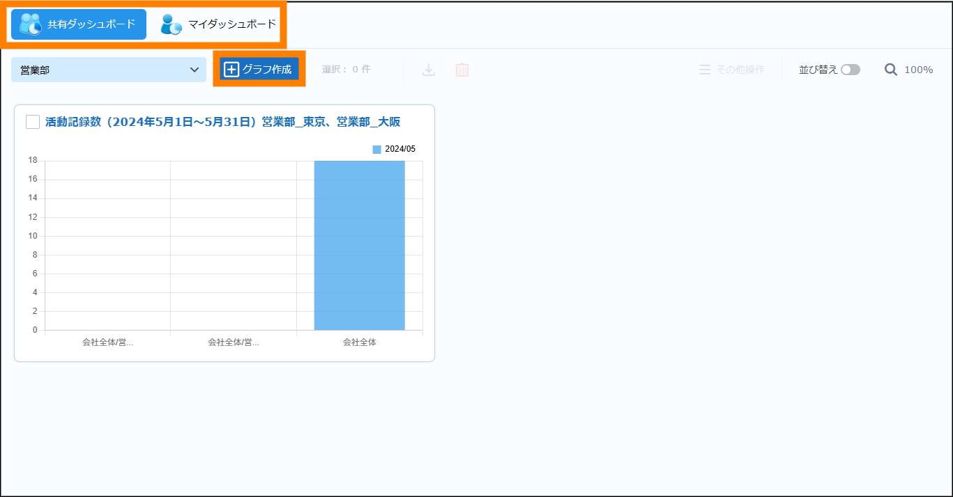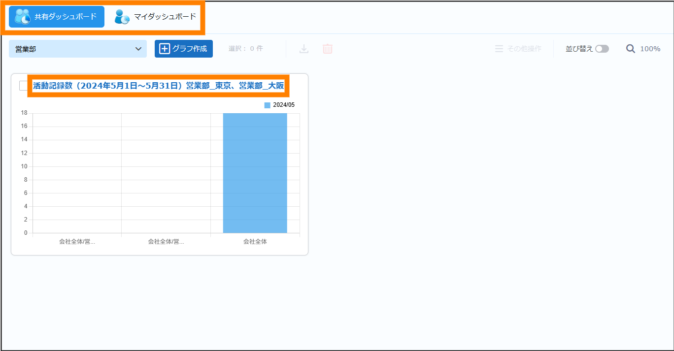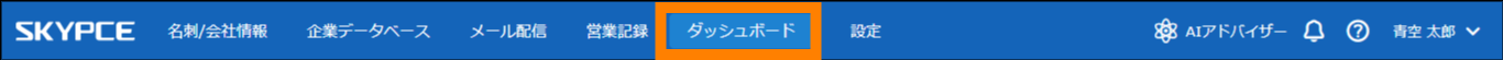 ダッシュボードを使用します。登録した名刺の枚数や活動記録の数をグラフとして表示し、営業活動に役立てることができます。ダッシュボードには、ほかのユーザーとグラフを共有して表示できる「共有ダッシュボード」と自分(ログインしたユーザー)のみが閲覧できる「マイダッシュボード」があります。