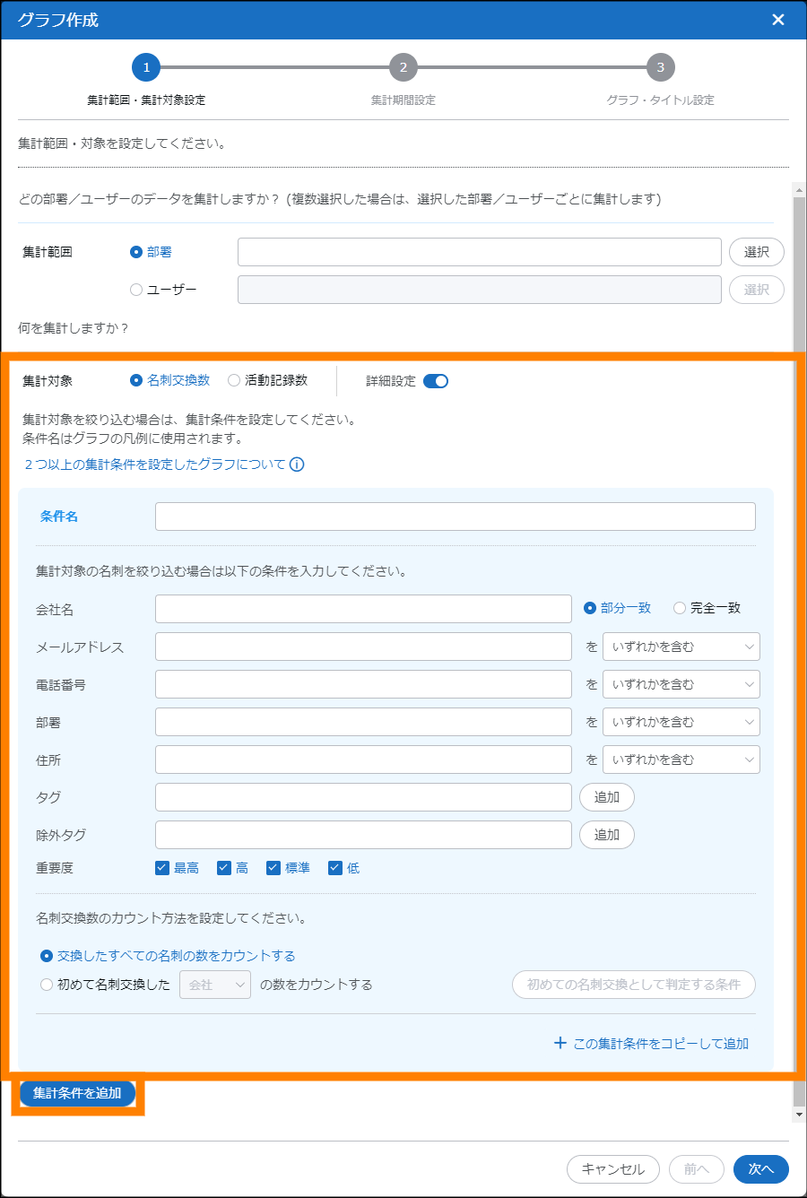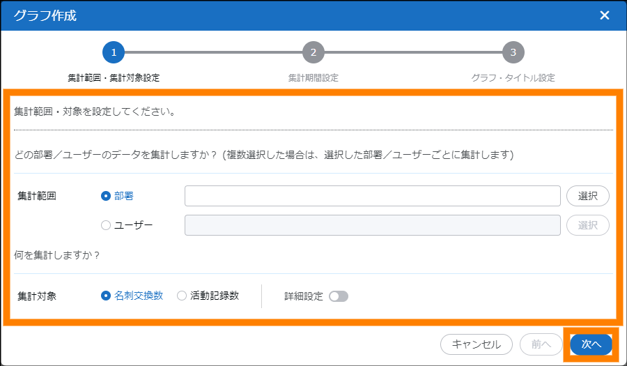 | 集計対象 | 集計対象を設定します。「名刺交換数」または「活動記録数」を選択してください。「詳細設定 |