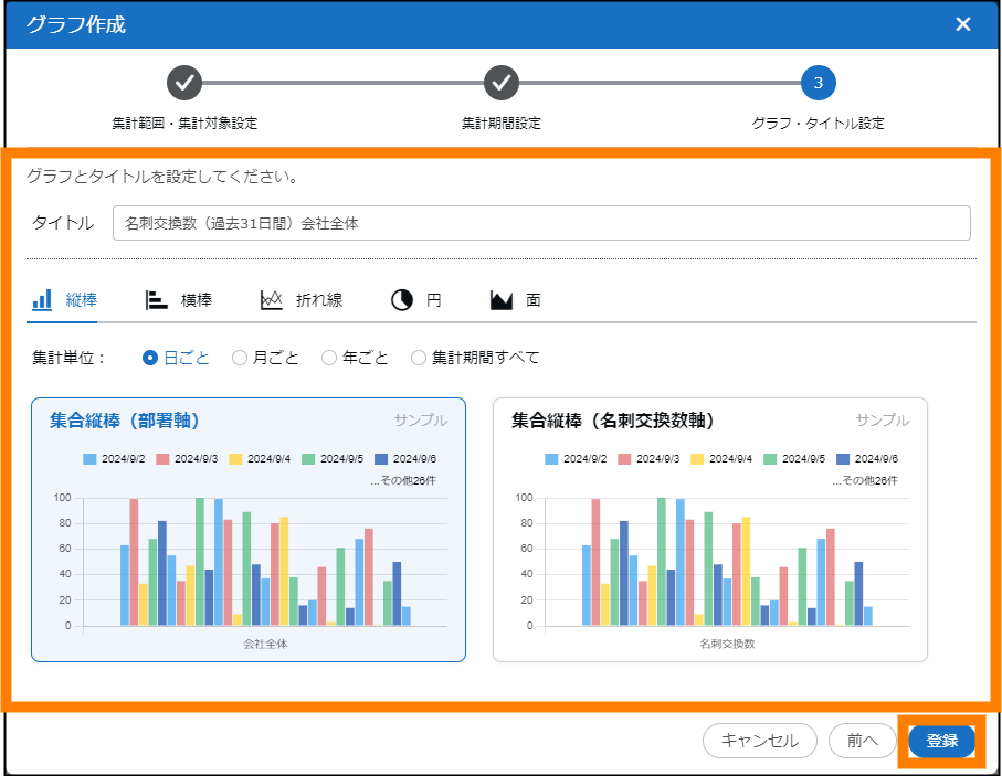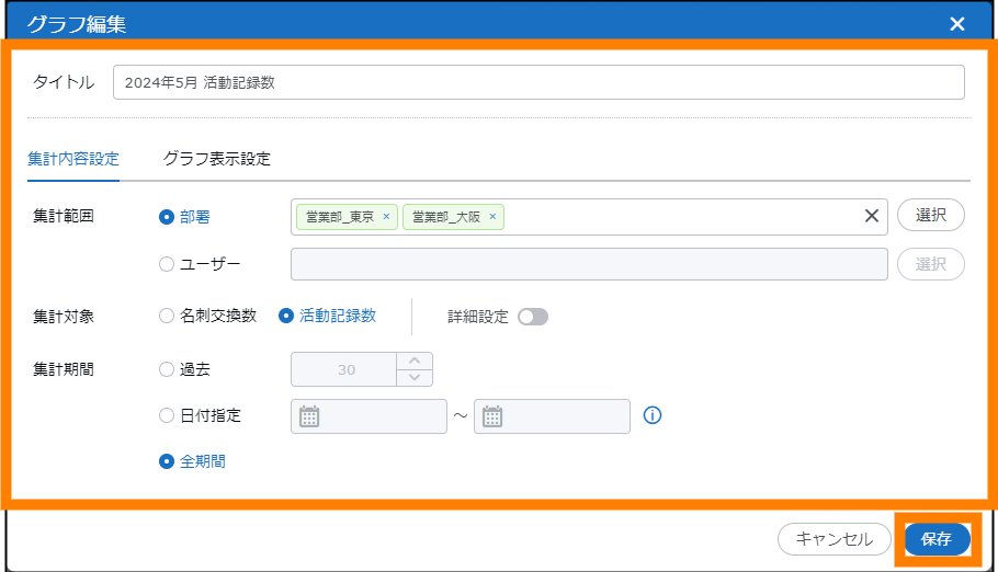 | タイトル | 作成するグラフのタイトルを入力します。"集計対象(集計期間)集計範囲"が初期値として表示されます。 |