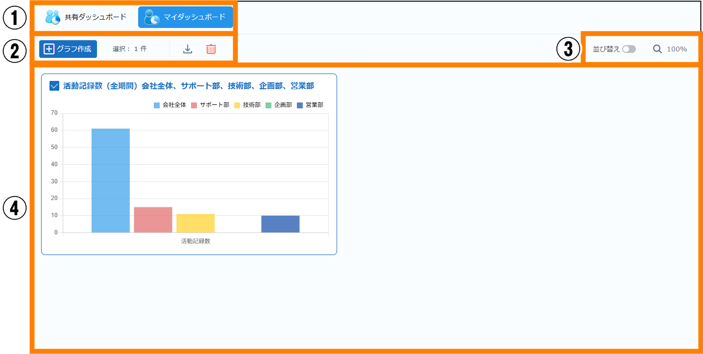 | ① | 表示切り替え | クリックすると、表示が切り替わります。選択できる項目は、「共有ダッシュボード」「マイダッシュボード」です。 | ― |