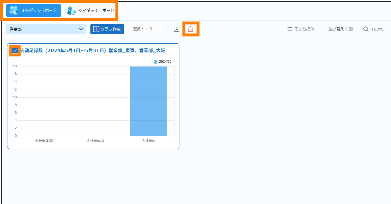 ① ダッシュボードを選択し、削除するグラフにチェックを入れ、