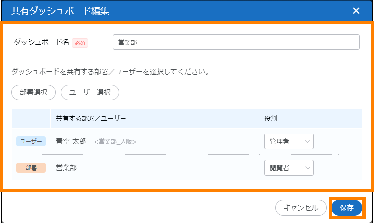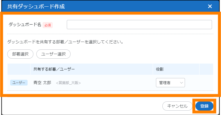 | 部署選択 | ダッシュボードを共有する部署を選択してください。 |