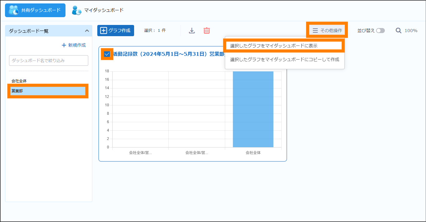 ② 任意のダッシュボードをクリックし、コピーするグラフにチェックを入れ、「その他操作」の「選択したグラフをマイダッシュボードに表示」をクリックする。