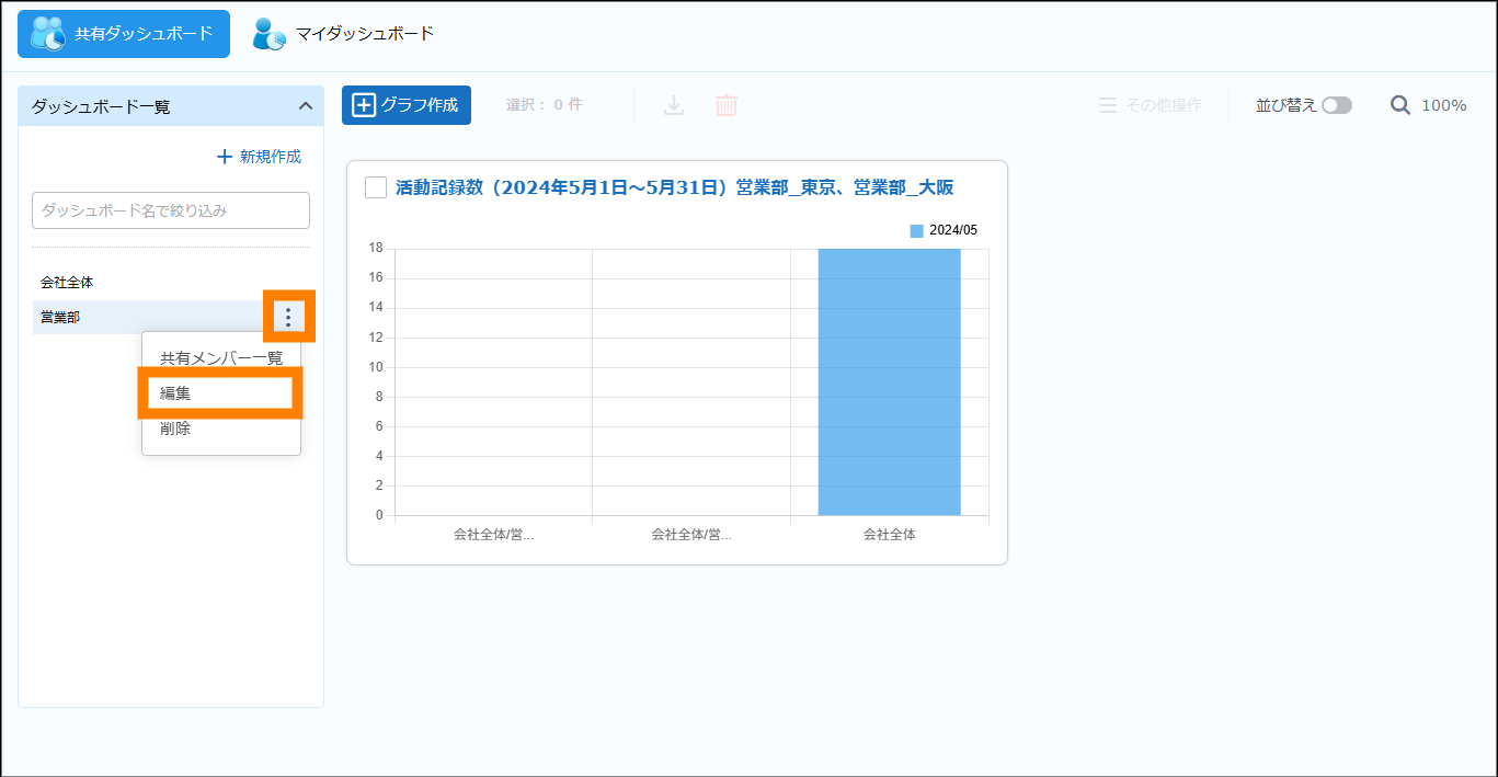 作成した共有ダッシュボードを編集、削除します。