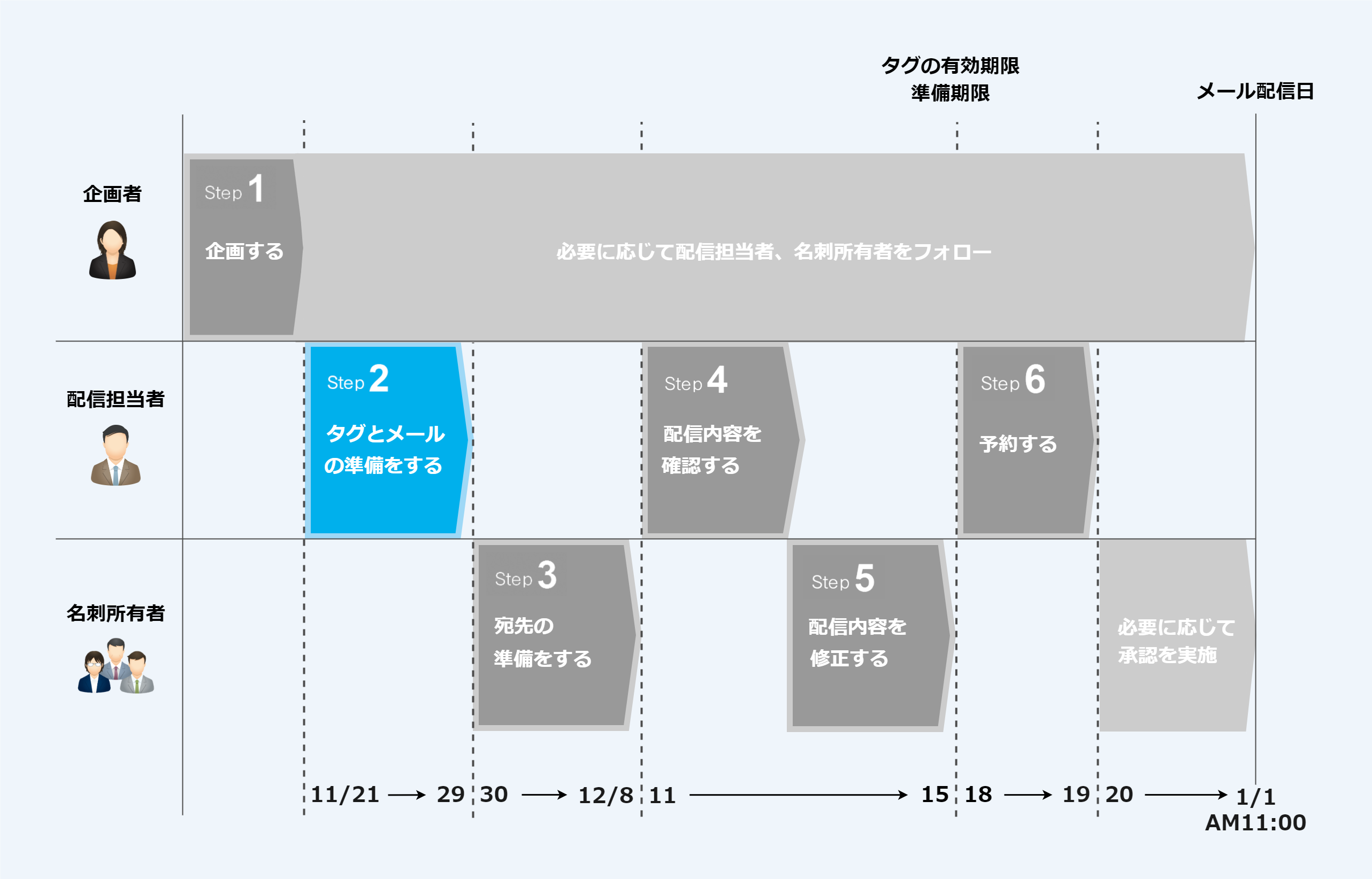 Step2では、タグやメール配信設定の登録を行い、宛先の準備をする名刺所有者へ必要事項を伝えることが目的になります。