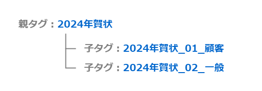 メールの文面を変えたい宛先グループの数だけ共有タグを作成します。今回は、企画者から「顧客」「一般」向けの2パターンのメールを作成するように依頼があったため、親タグ「2024年賀状」を登録し、子タグ「2024年賀状_01_顧客」「2024年賀状_02_一般」を登録します。