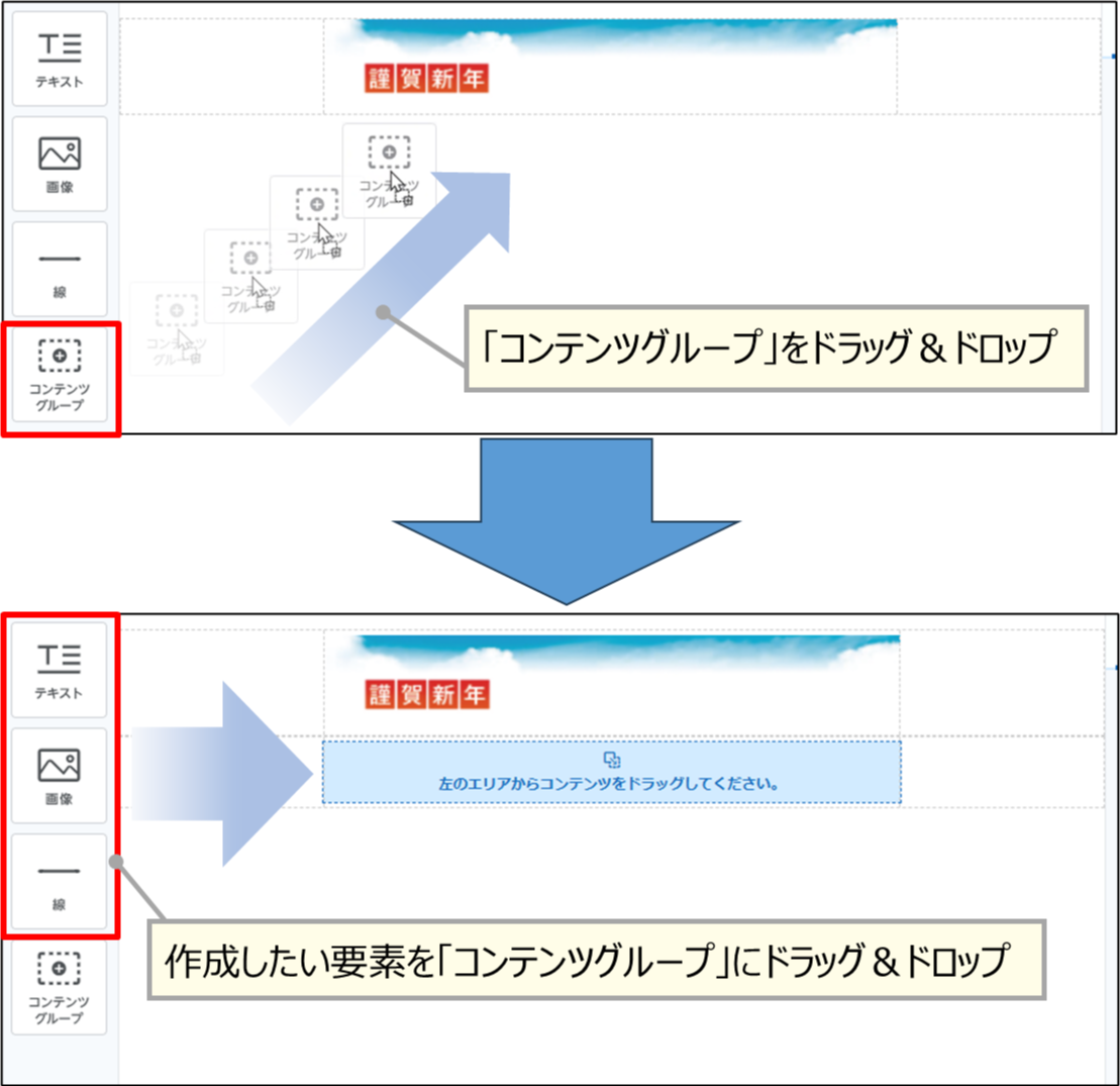 メールテンプレートの本文を作成するには、まず「コンテンツグループ」を作成します。 コンテンツグループとは、メールテンプレートの本文内の要素(テキスト、画像、線)を配置するための領域です。コンテンツグループに要素をまとめることで背景色などの設定値を統一できますが、メールテンプレートの本文の作成に慣れないうちは、1つのコンテンツグループにつき、1つの要素を配置することをお勧めします。