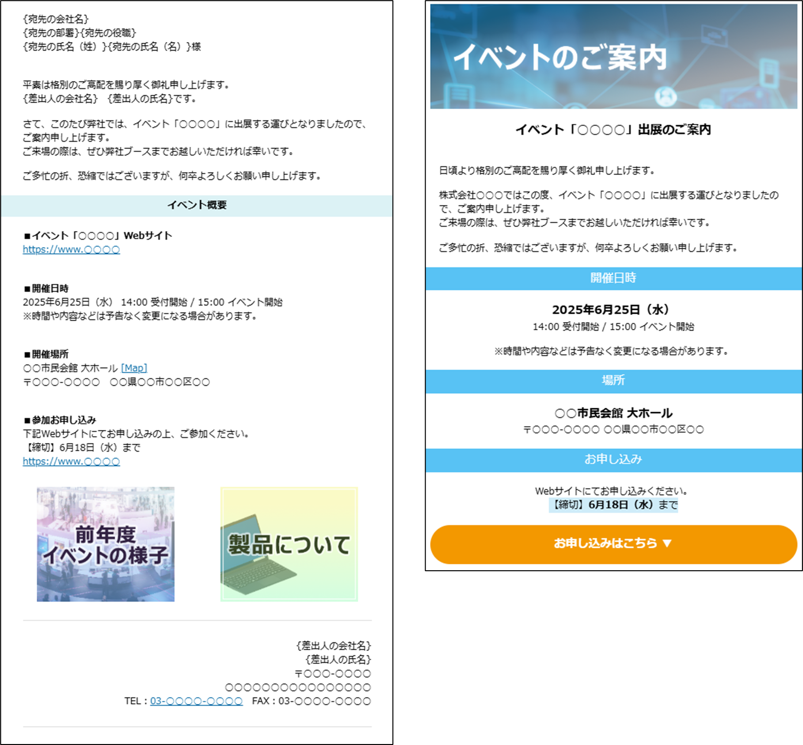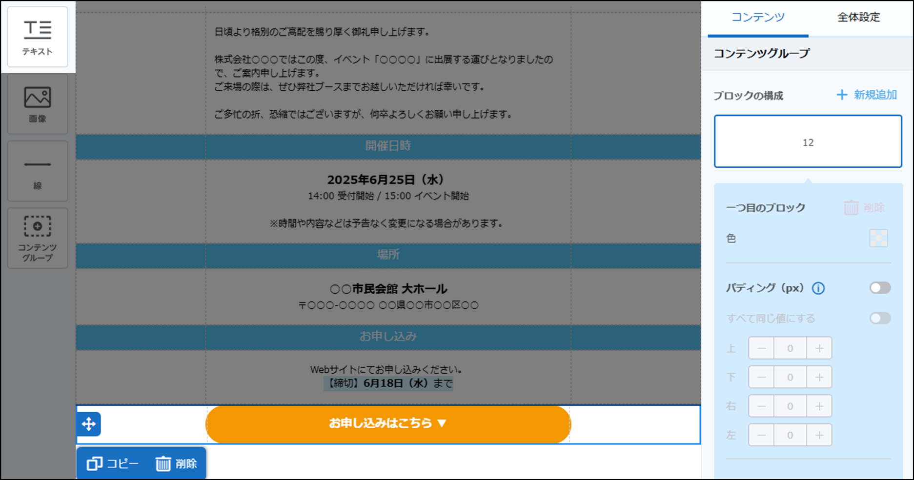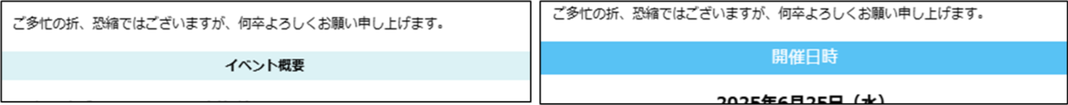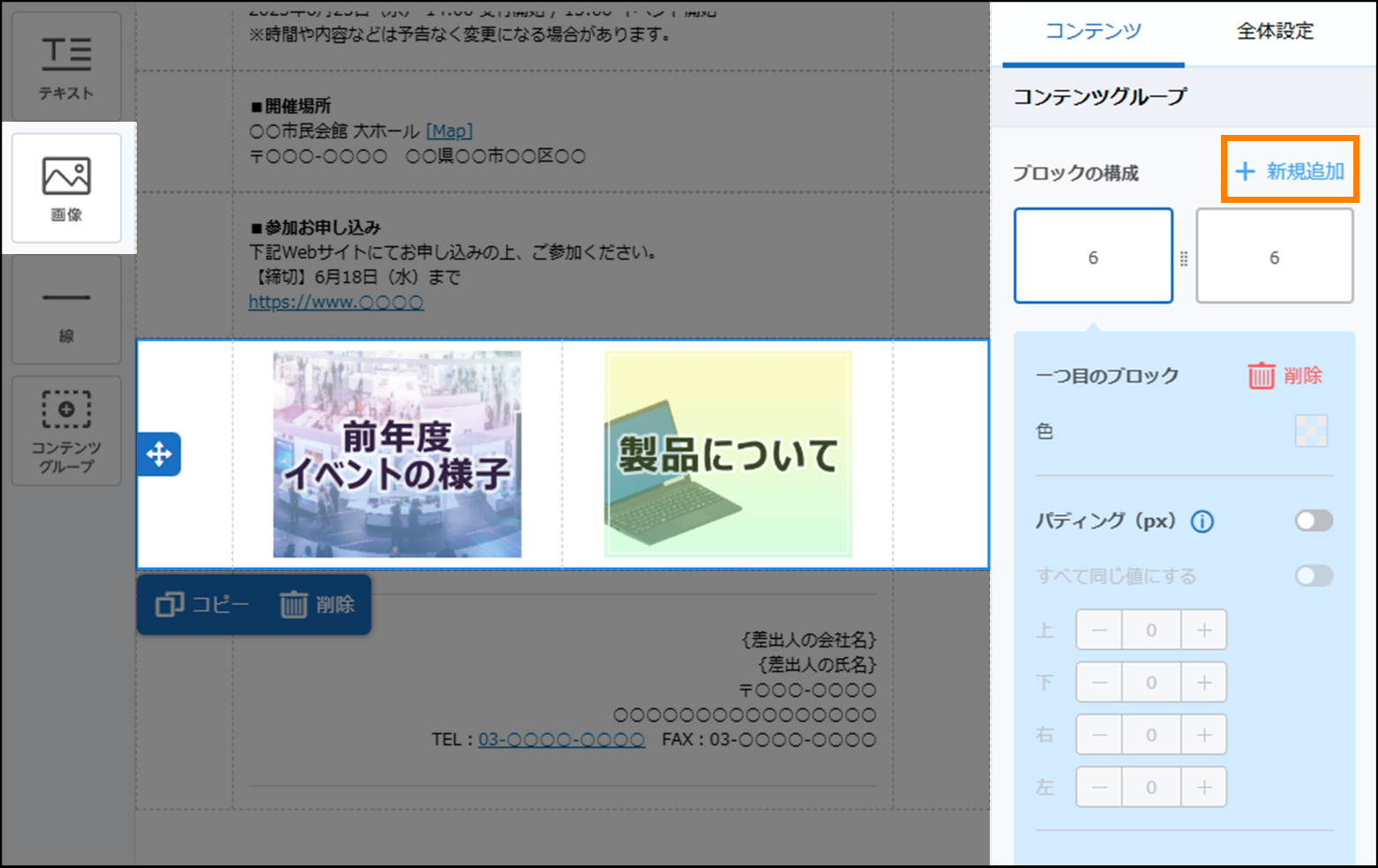 コンテンツグループの設定を応用することで、より目を引きやすいメールを作成することもできます。設定については、次のイベント出展の案内メールを例として説明します。