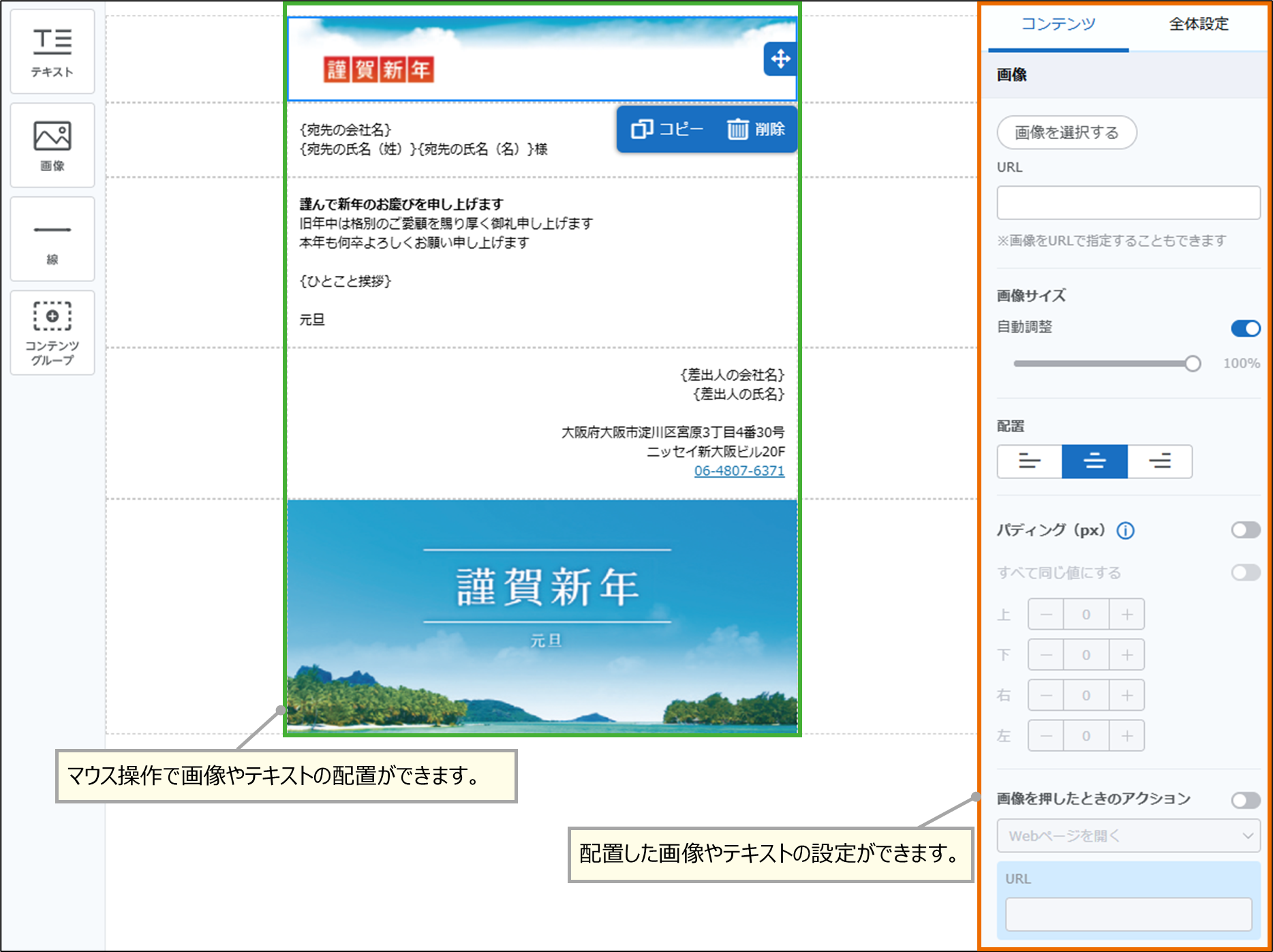 作成したコンテンツグループごとに画像や文字を配置し、メールテンプレートの本文を作成します。各コンテンツの設定は、「コンテンツ」タブから設定できます。