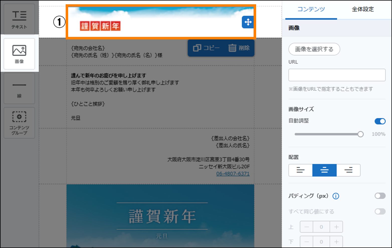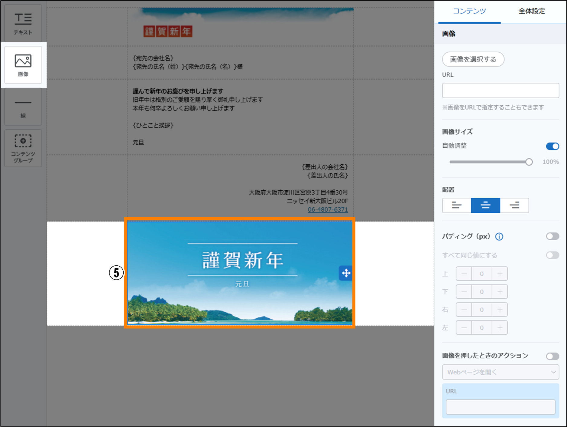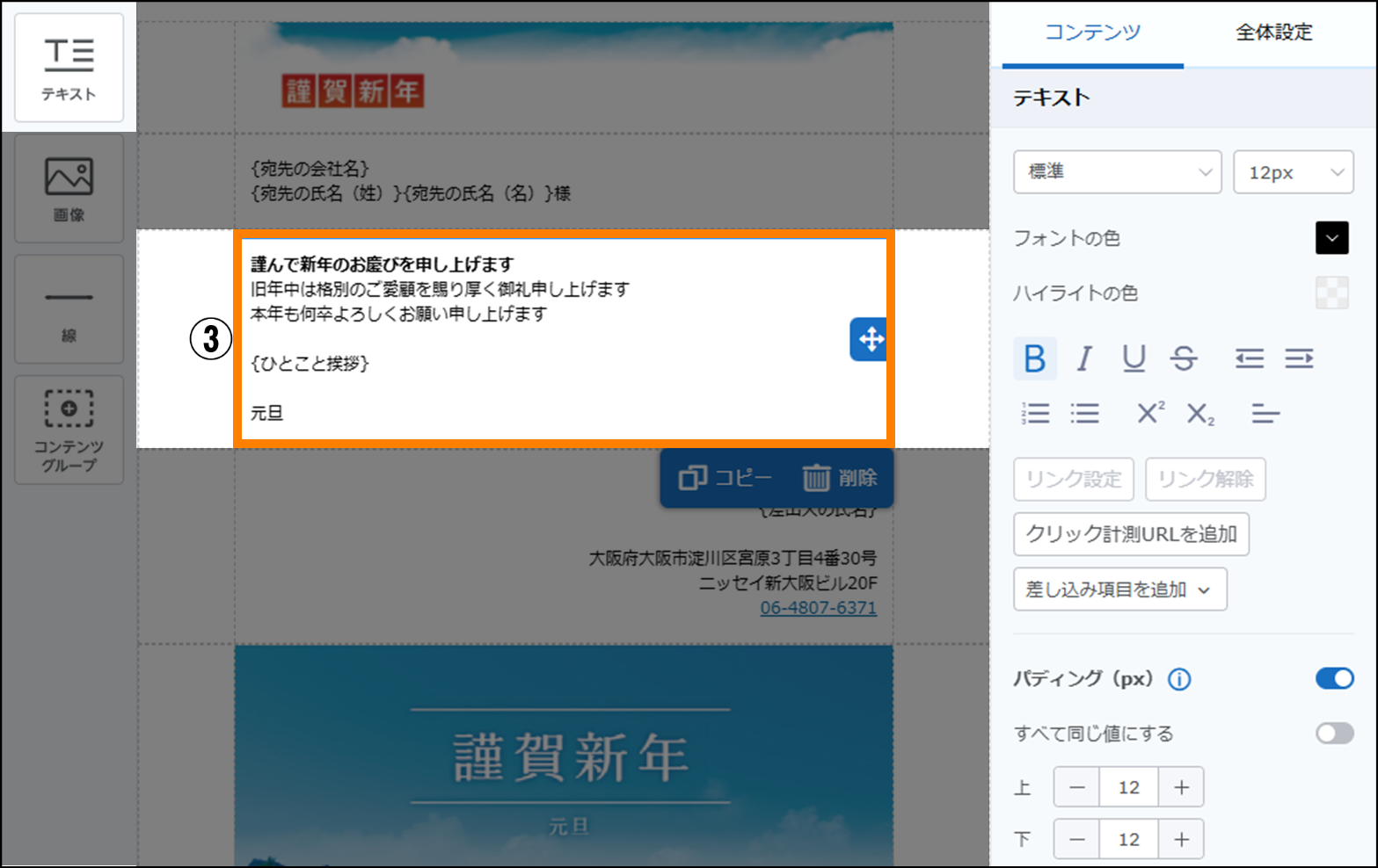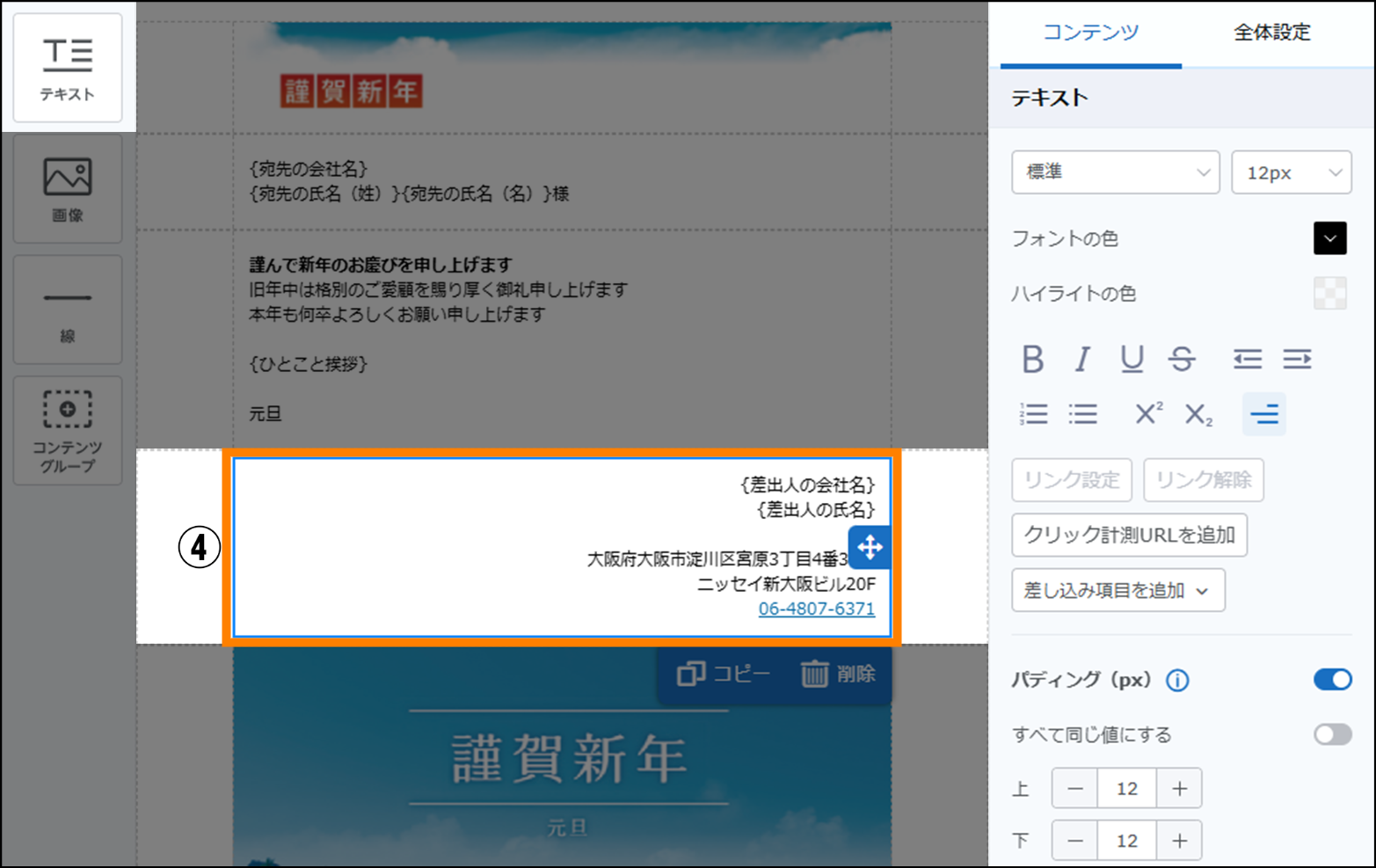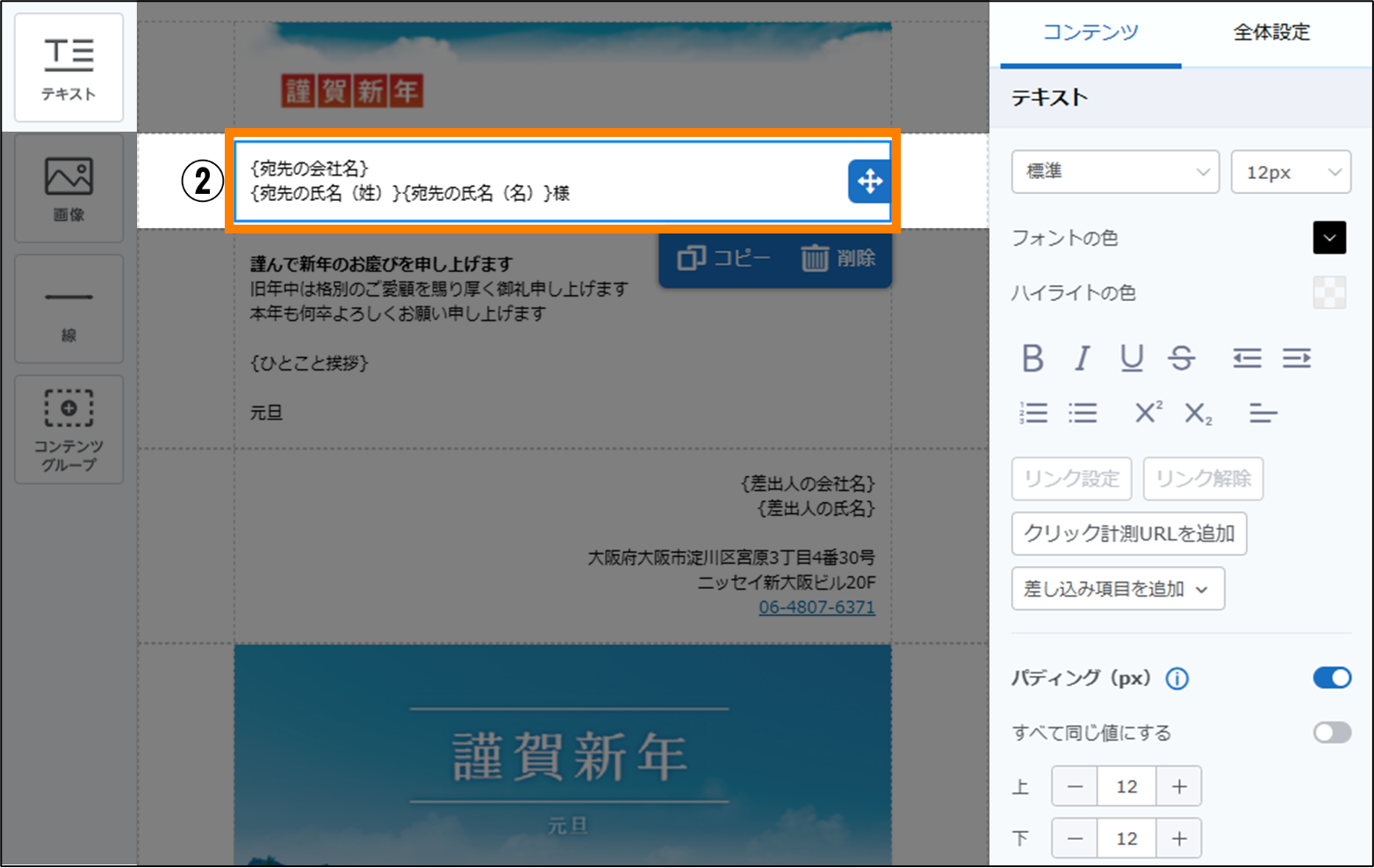 左のエリアの「テキスト」コンテンツを、コンテンツグループにドラッグ&ドロップし、差出人の情報を入力します。「テキスト」コンテンツの「差し込み項目を追加」から、差出人の情報に必要な項目を選択します。