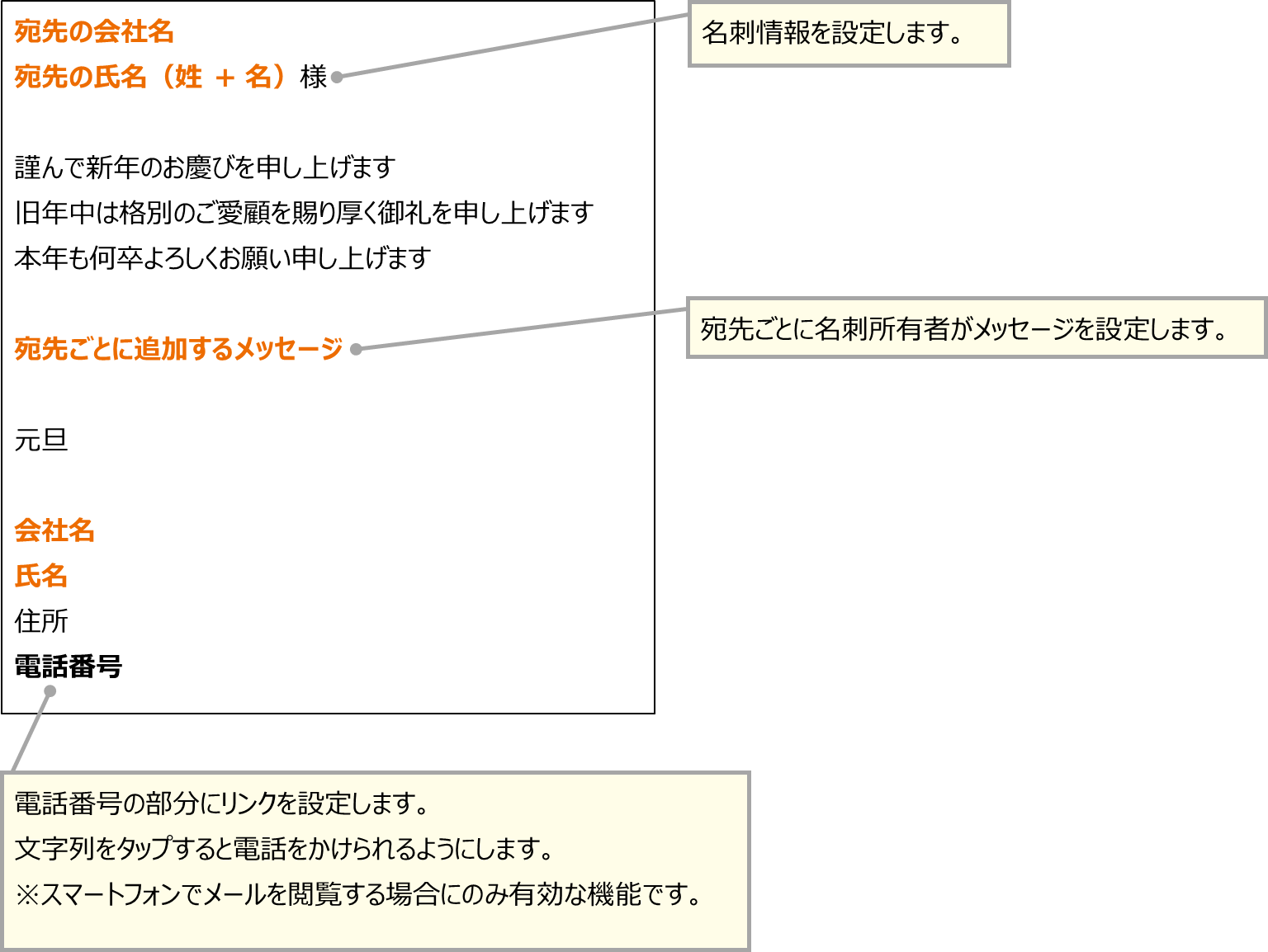 はじめにメールの内容を検討します。どのような構成にするのか、どこにリンクを設定するのかなど、伝えたい内容に合わせて考えます。ここでは上記の内容に加え、名刺情報をメールに挿入する箇所や、宛先ごとに追加するメッセージの配置も検討しています。