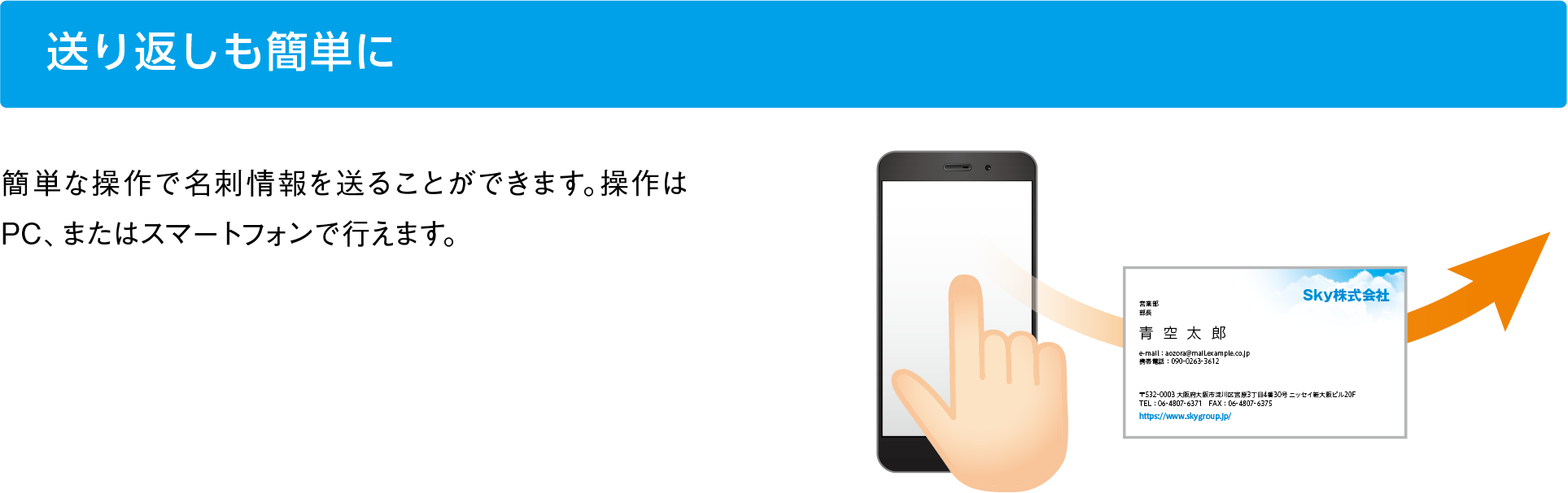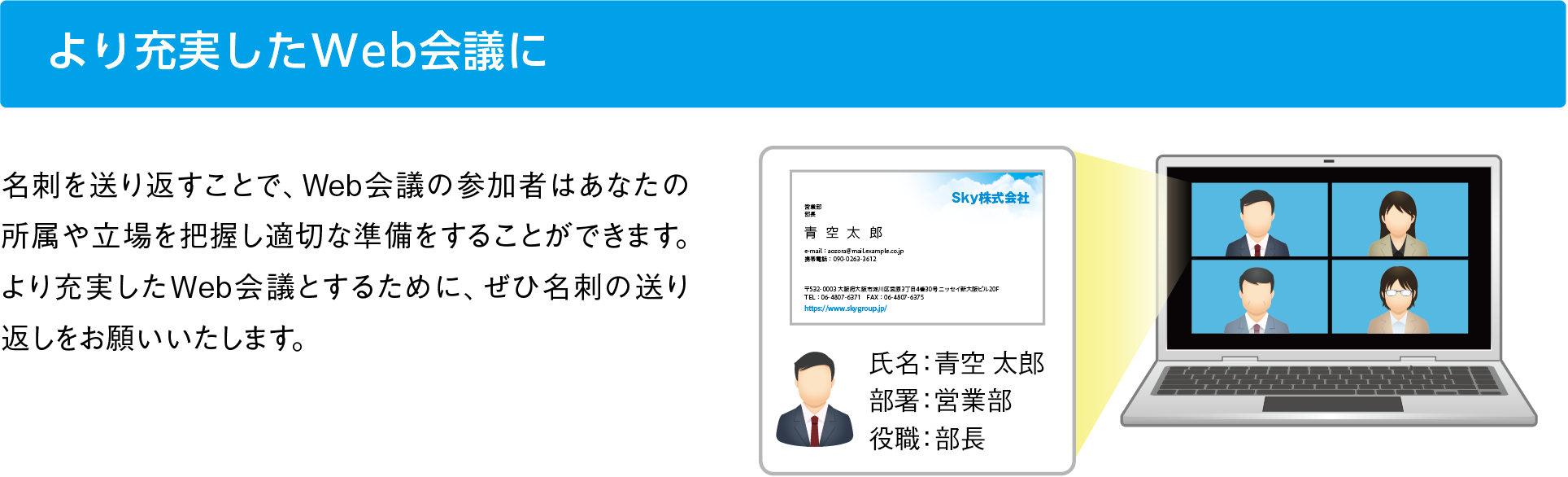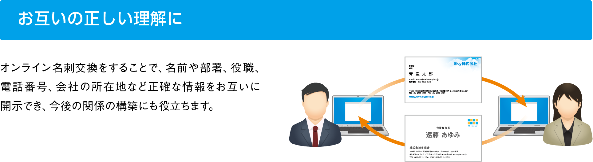 オンライン名刺交換とは、営業支援 名刺管理サービス「SKYPCE Cloud Edition」に搭載されている、オンラインで名刺を交換できる機能です。Web会議などのオンラインでの出会いにおいて、相手との関係構築のためにぜひオンライン名刺交換をご活用ください。