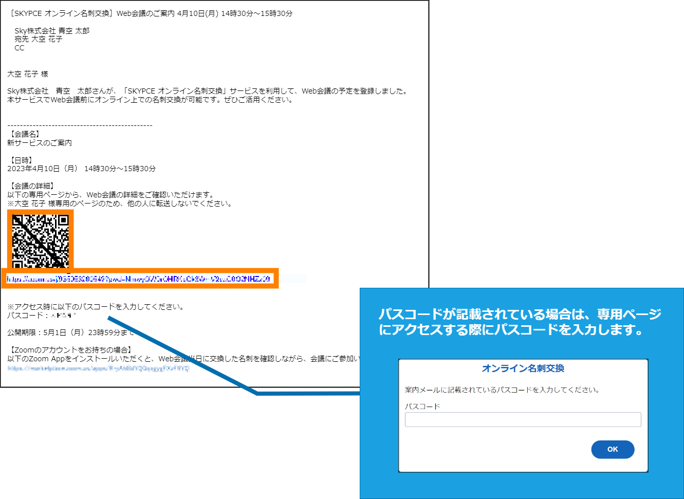 - ZoomでWeb会議を行う場合、連携して名刺情報を表示することができます。詳しくは、別冊『SKYPCE オンライン名刺交換 Zoom連携機能 操作ガイド』を参照してください。