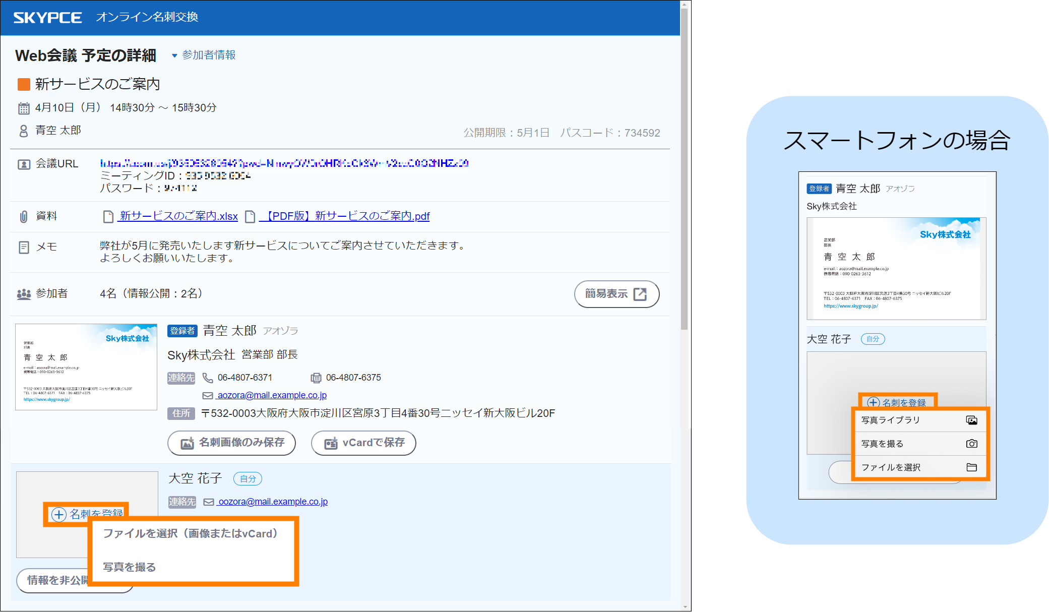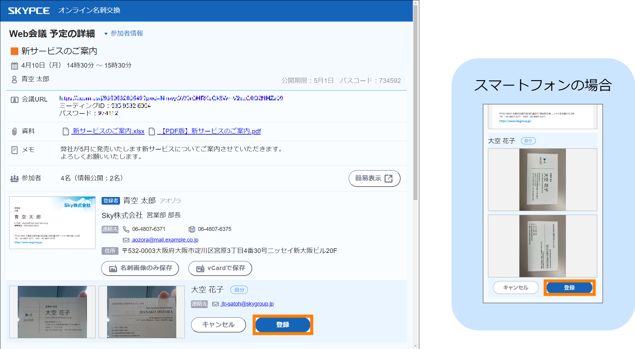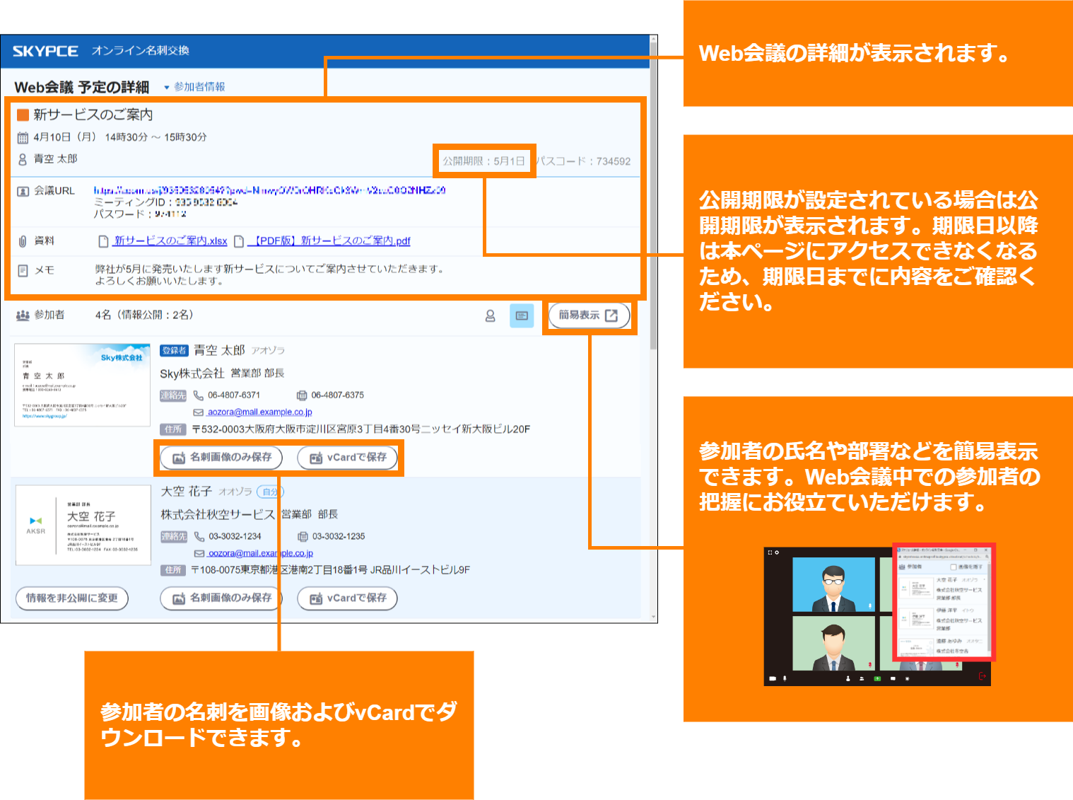 メールのURLから閲覧できる「Web会議 予定の詳細」画面では、Web会議の詳細や資料の確認、参加者の名刺のダウンロードなどができます。