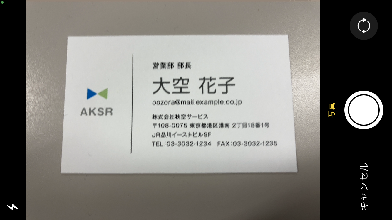 - PCまたはスマートフォンのカメラを使用し、名刺を撮影して登録することもできます。「写真を撮る」を選択し、名刺の写真を撮影します。