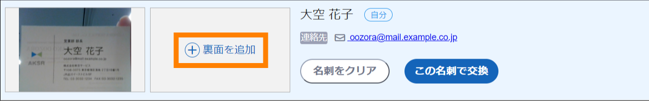 - 名刺のうら面にも記載がある場合は「裏面を追加」を選択し、うら面も撮影します。