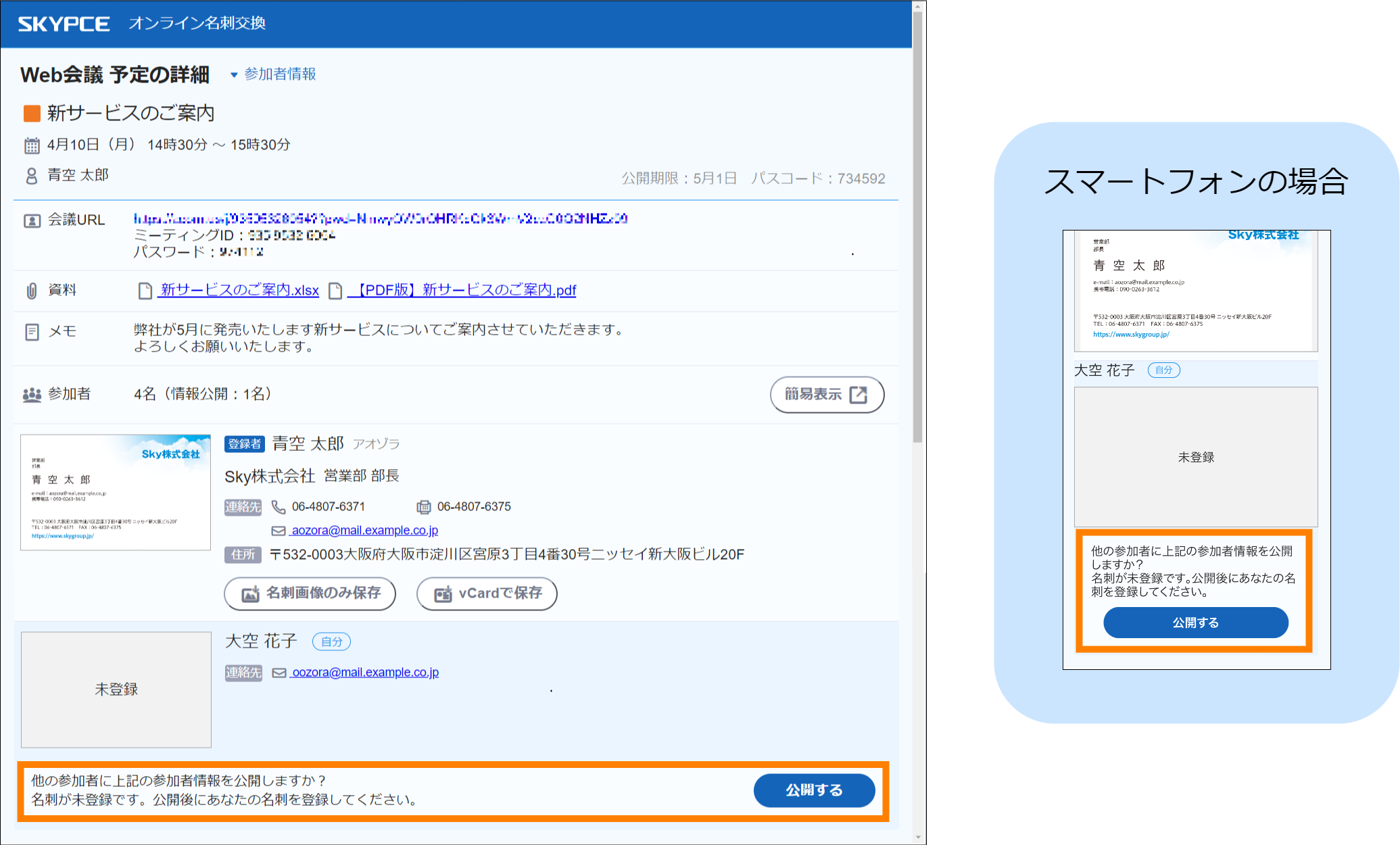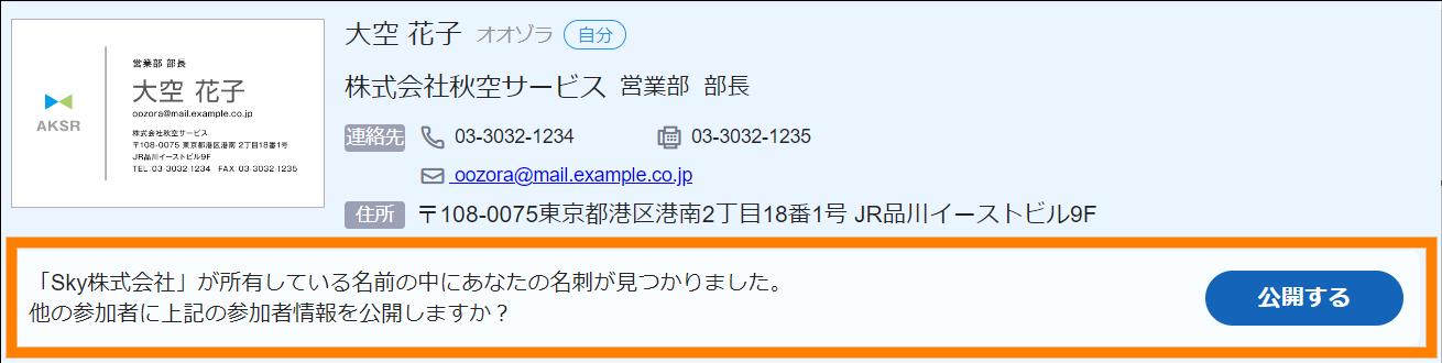 - 会議を主催する組織の方と名刺交換をしたことがある場合、次の内容が表示されることがあります。[公開する]を選択すると操作が完了するため、以降の操作は不要です。
