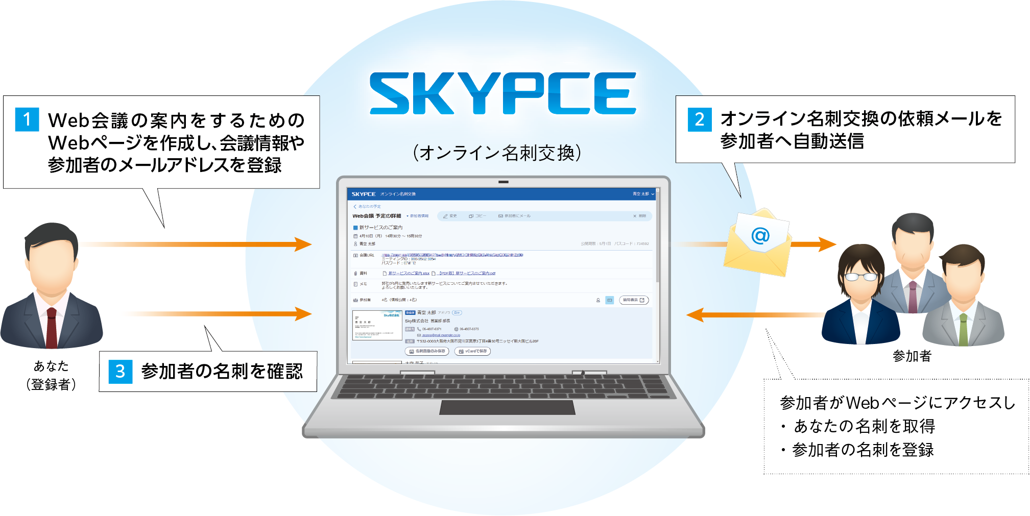 - SKYPCE オンライン名刺交換は、Web会議の案内をするためにWebページを作成し、参加者とオンライン名刺交換を行う機能です。そのため、Web会議は別途Web会議ツールで作成する必要があります。