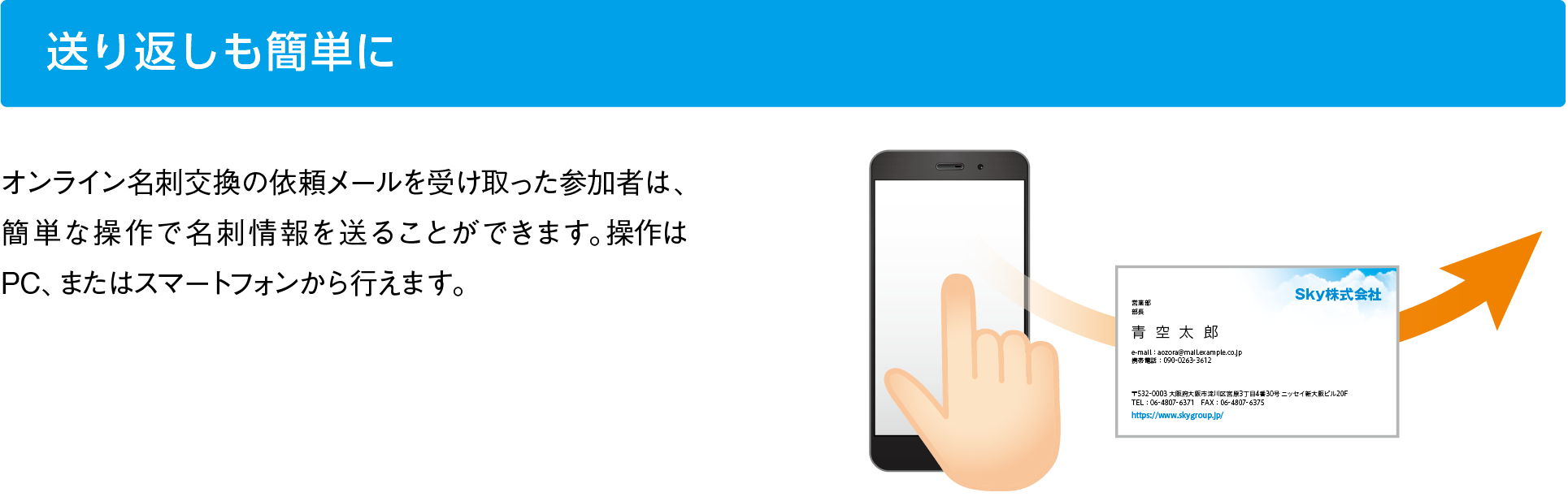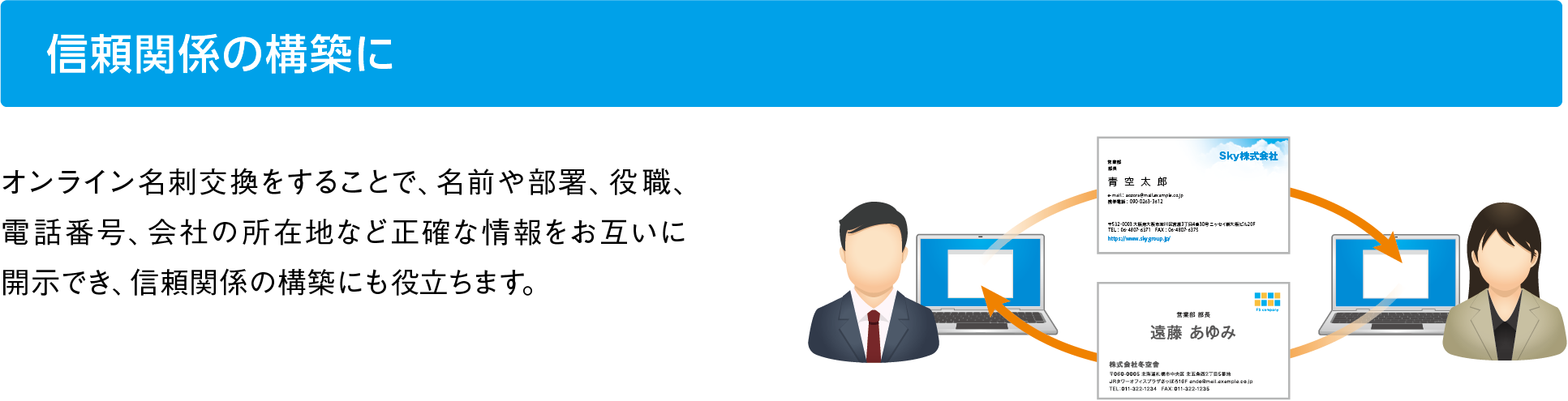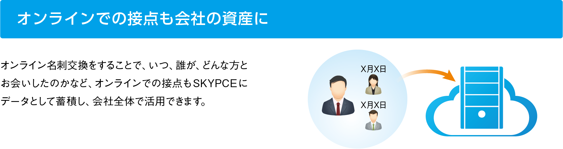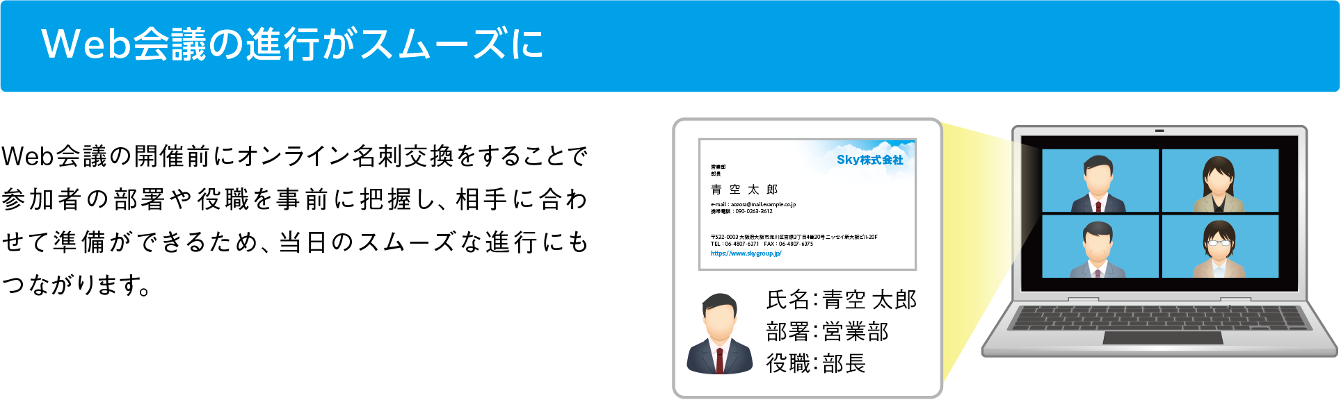 SKYPCE オンライン名刺交換とは、Web会議の開催前にオンラインで名刺を交換できる機能です。