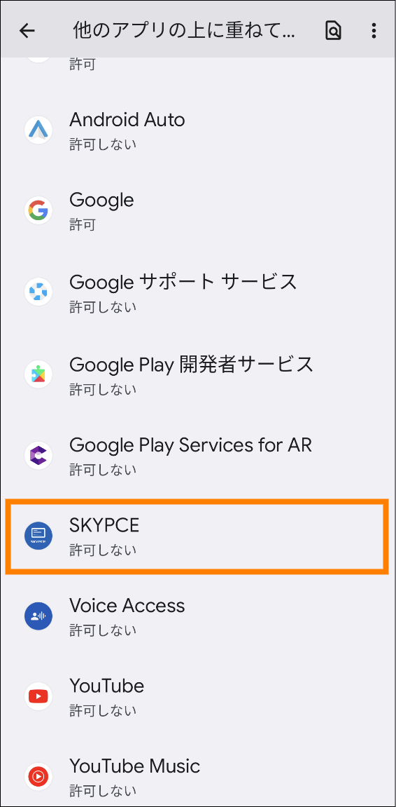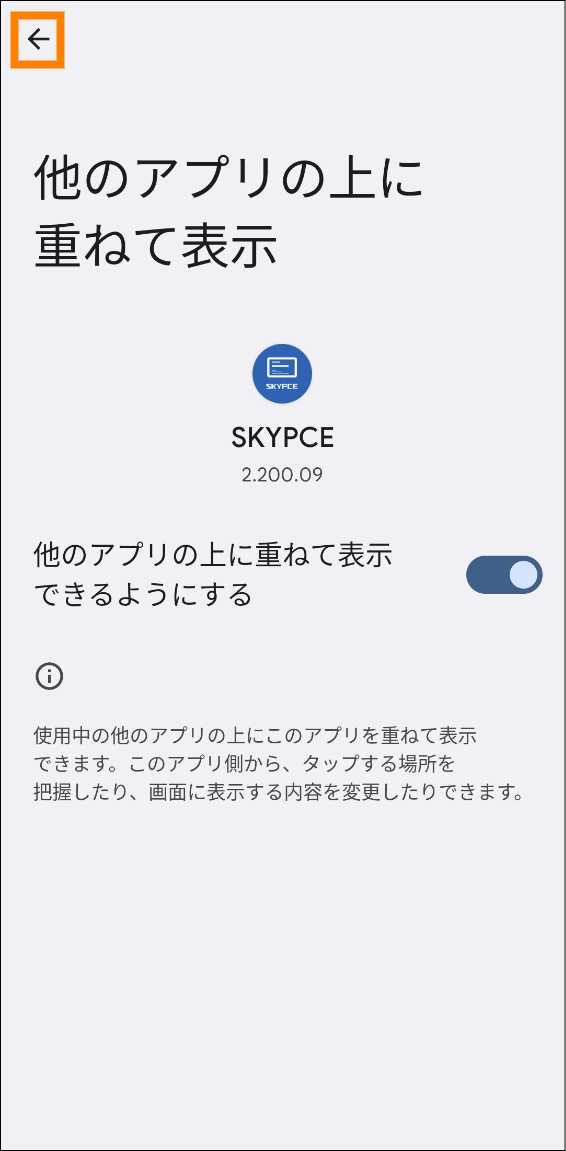 - (Android OSの場合)ほかのアプリの上に重ねて表示する機能を「SKYPCE(スマートフォンアプリ)」に許可