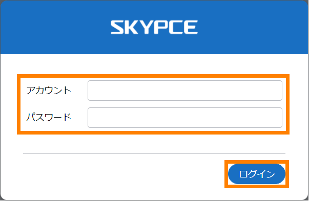 ① PCのWebブラウザーで「SKYPCE(名刺管理)」のログイン画面を表示し、「アカウント」「パスワード」を入力し、[ログイン]をクリックする。