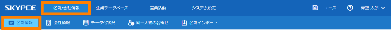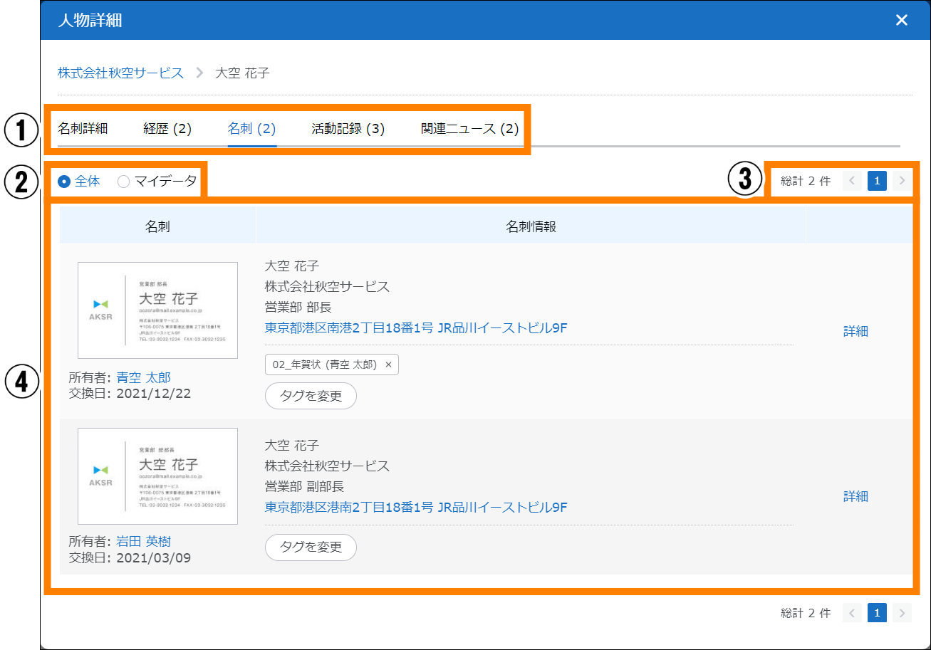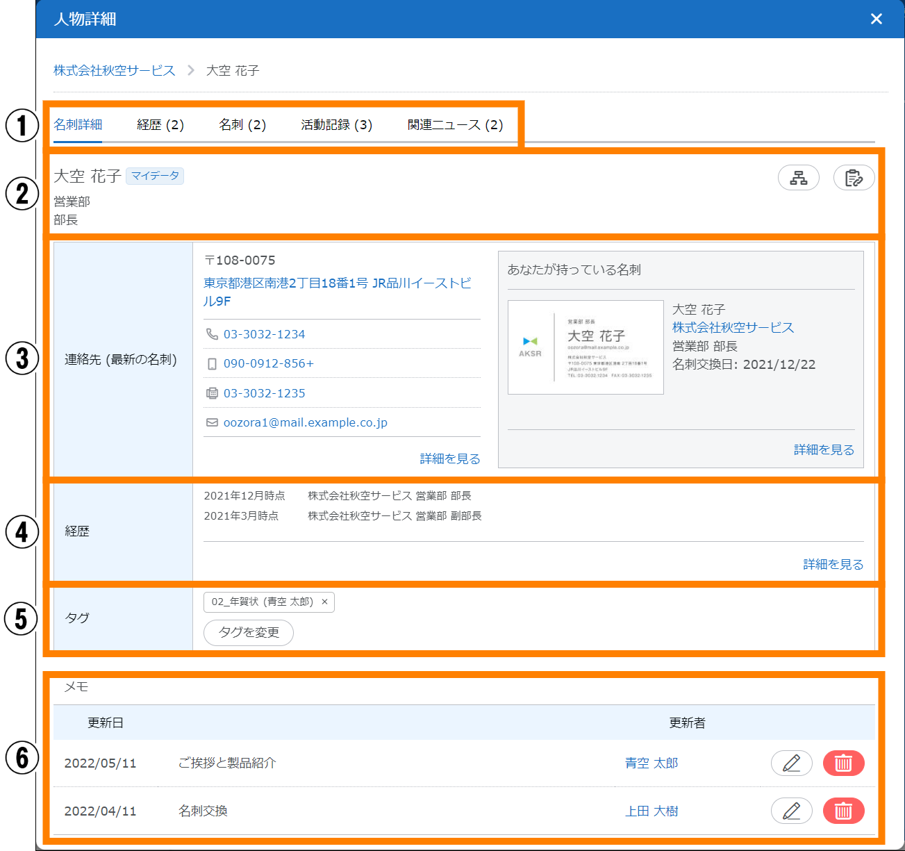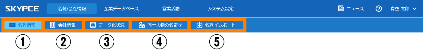| ① | 名刺情報 | 名刺情報の登録や閲覧、タグの操作などができます。 | 参照 |