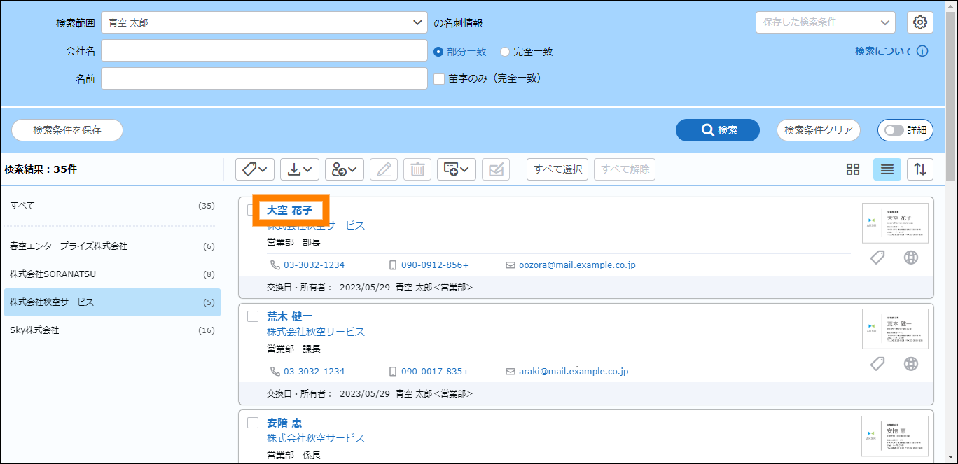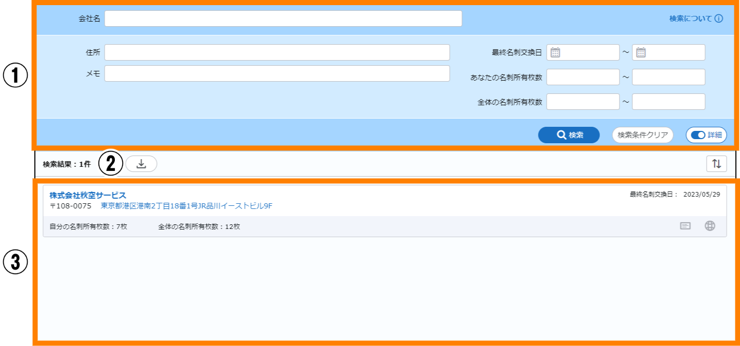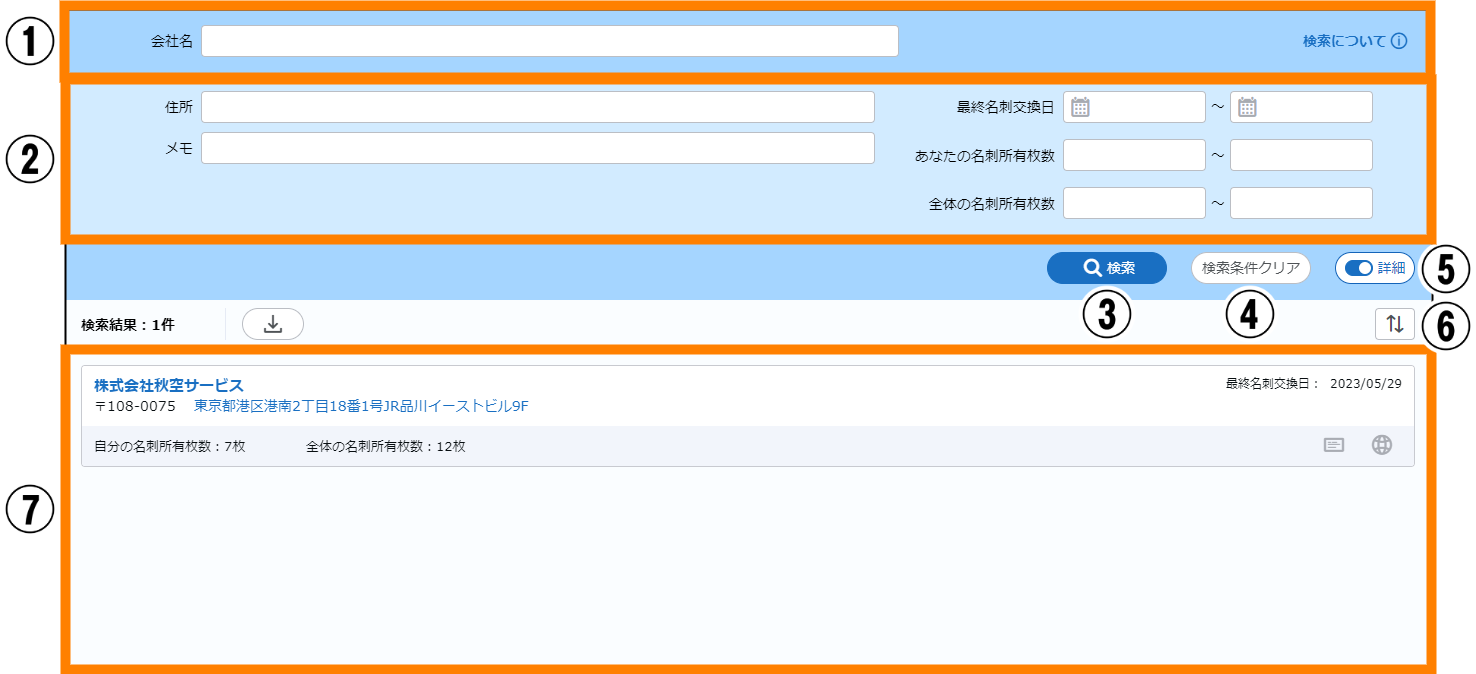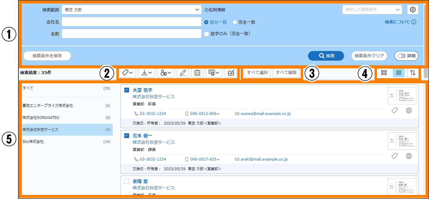 | ⑤ | 名刺情報一覧 | 検索結果の名刺情報が一覧で表示されます。 | ― |