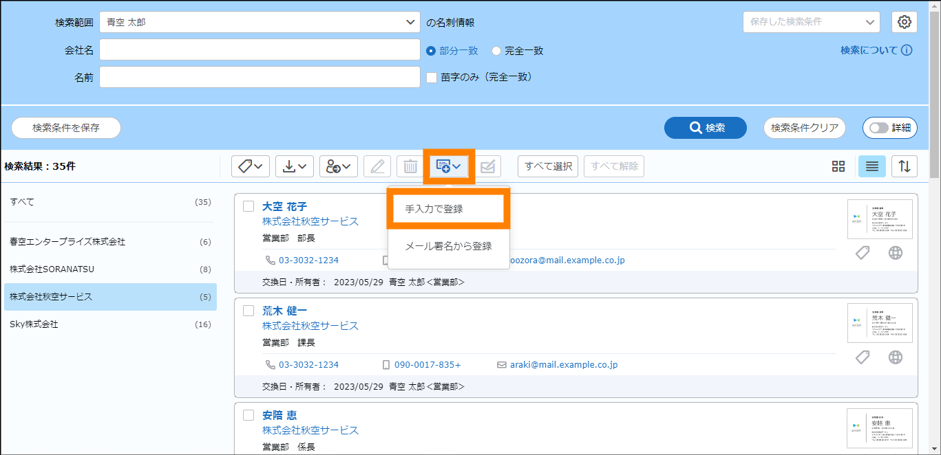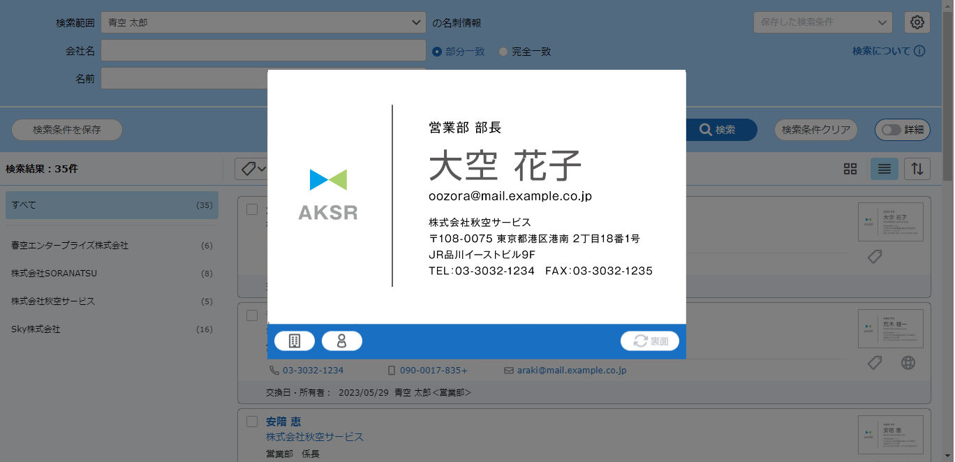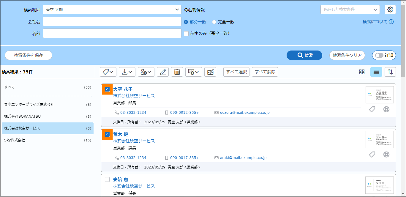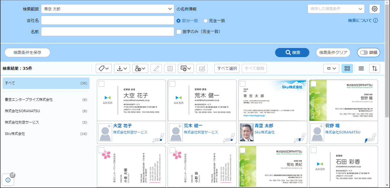 | ⑤ | 名刺情報一覧 | 検索結果の名刺情報が一覧で表示されます。 | ― |