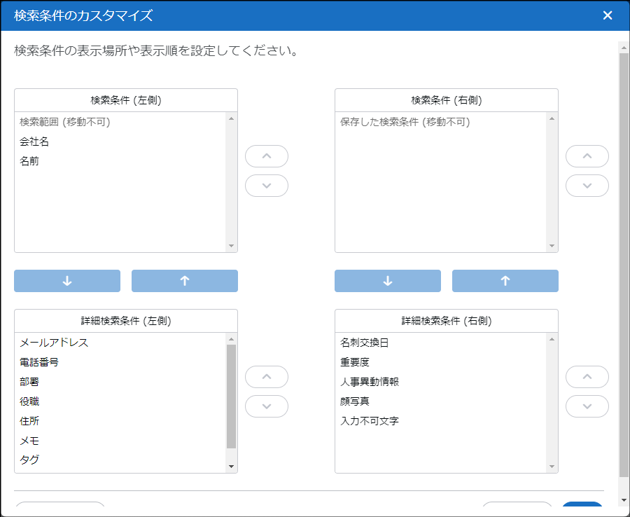 をクリックすると表示される「検索条件のカスタマイズ」画面で、検索や詳細検索に表示する項目が設定できます。