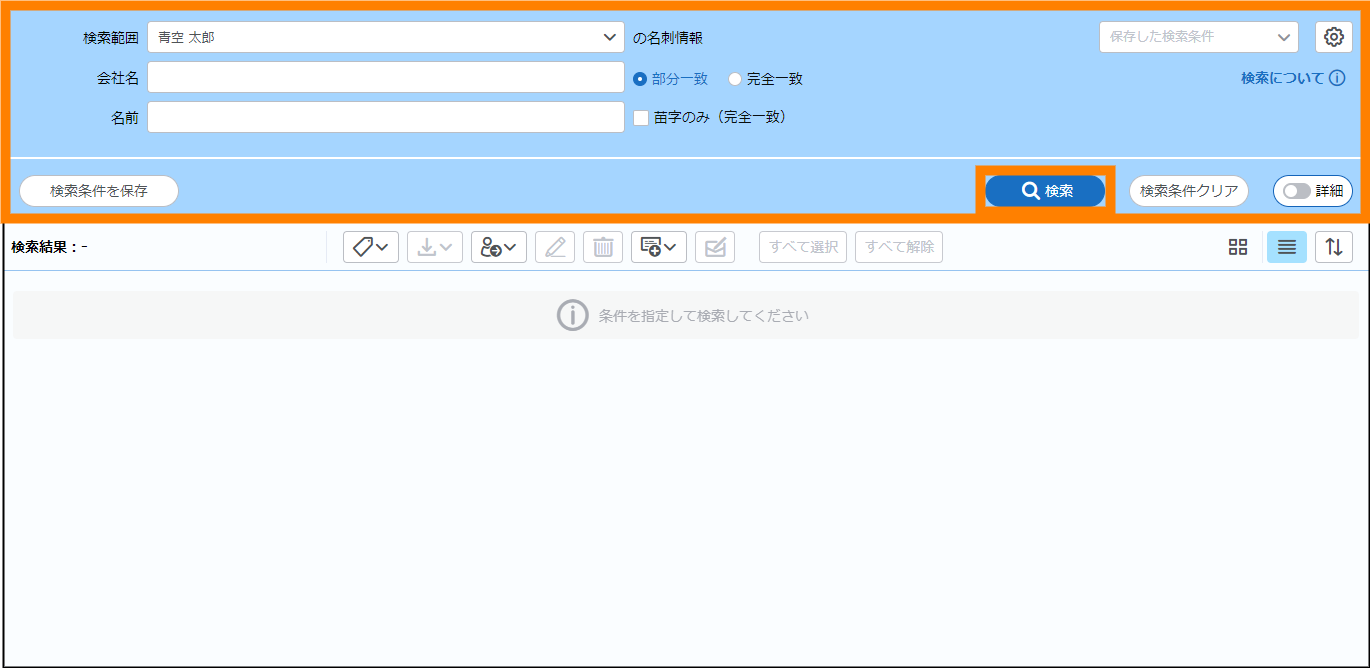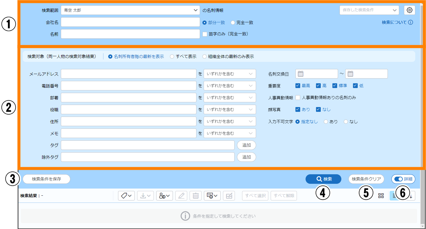 | 名刺所有者 | クリックすると、「ユーザー / 部署選択」画面が表示され、検索の対象となる範囲が選択できます。 | |