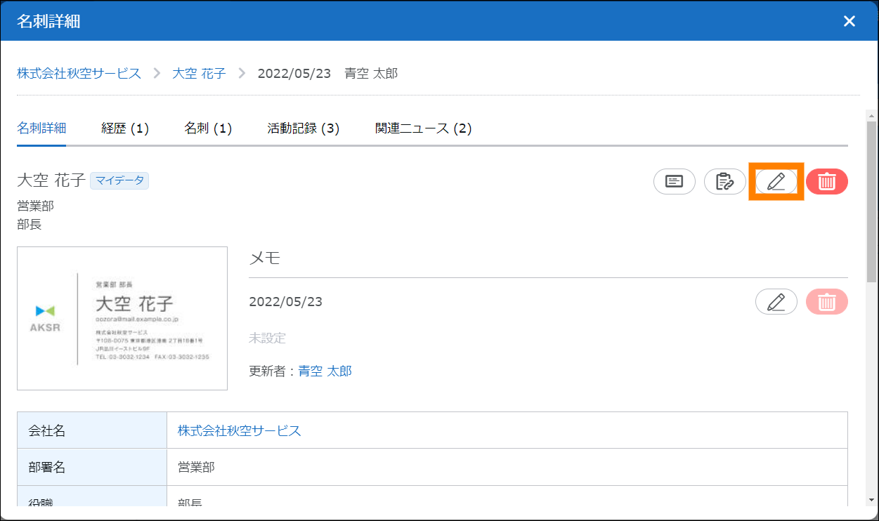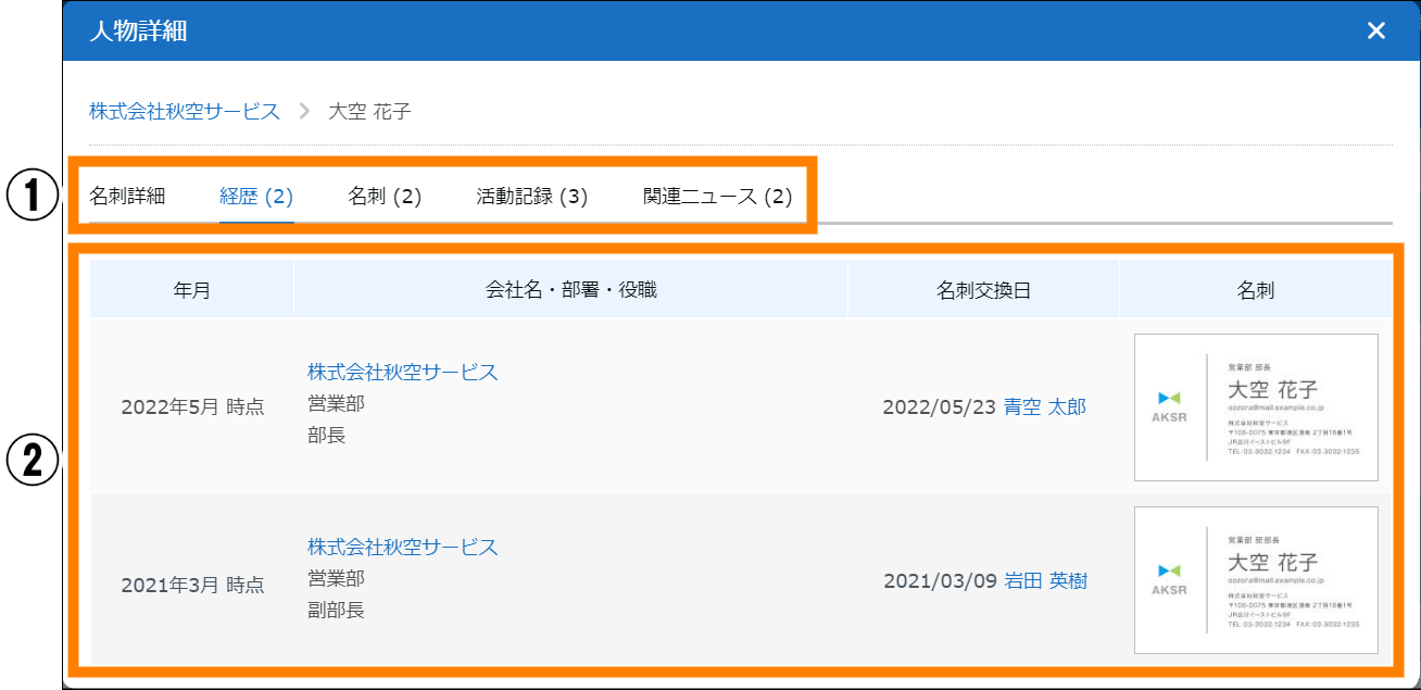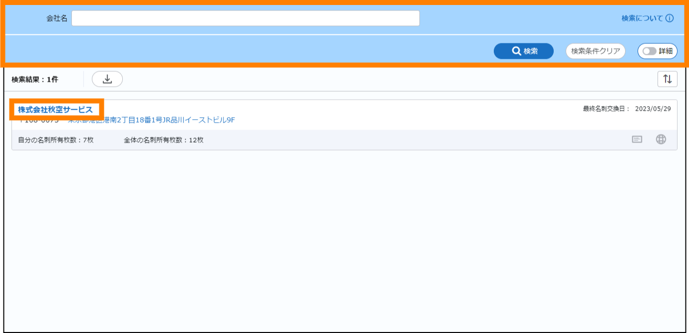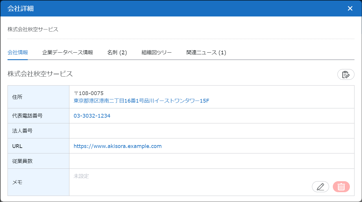 - 画面上部の「名刺」をクリックすると、会社情報と紐づいた名刺情報が確認できます。詳しくは、「3.2.1.1. 名刺情報を検索・閲覧する」を参照してください。