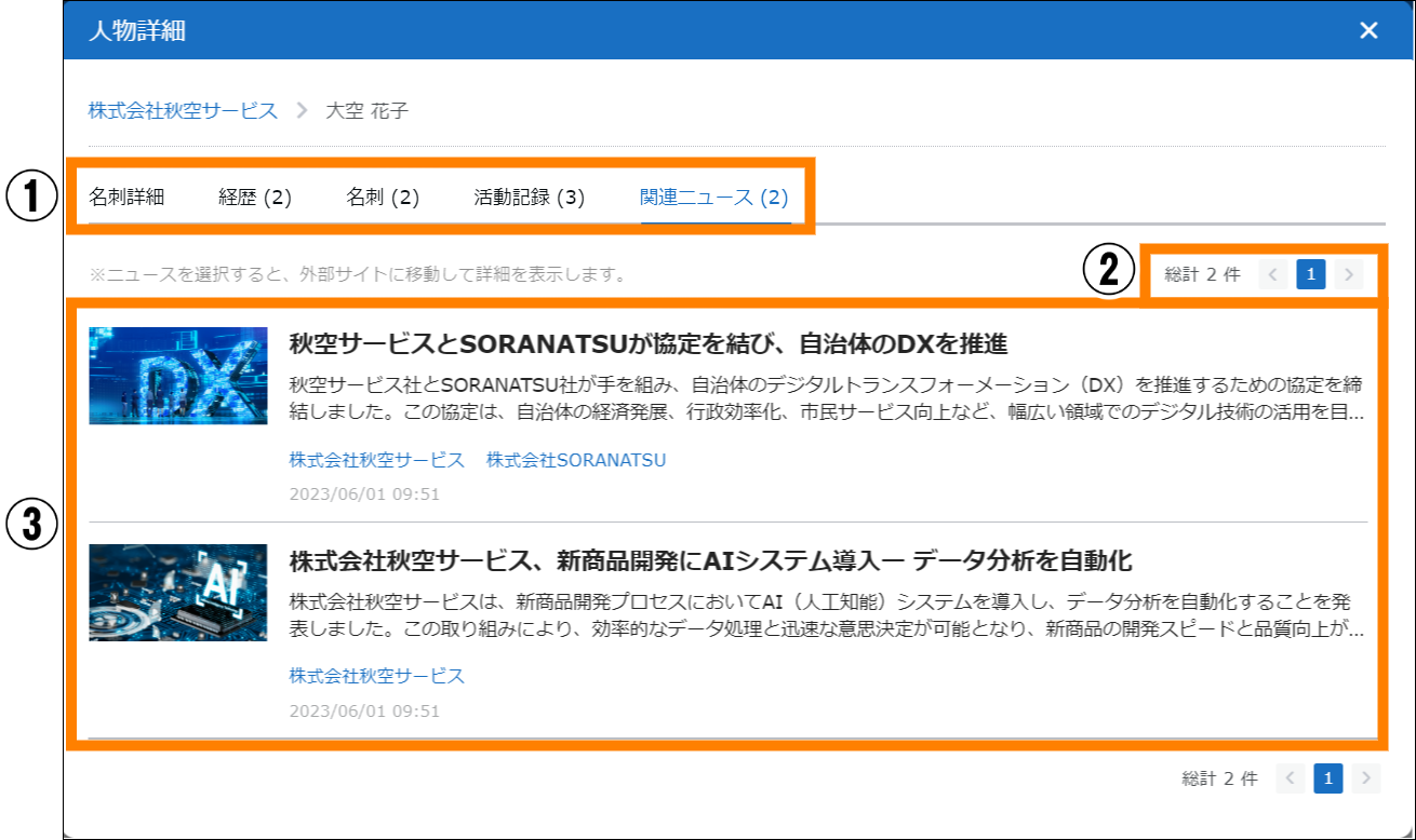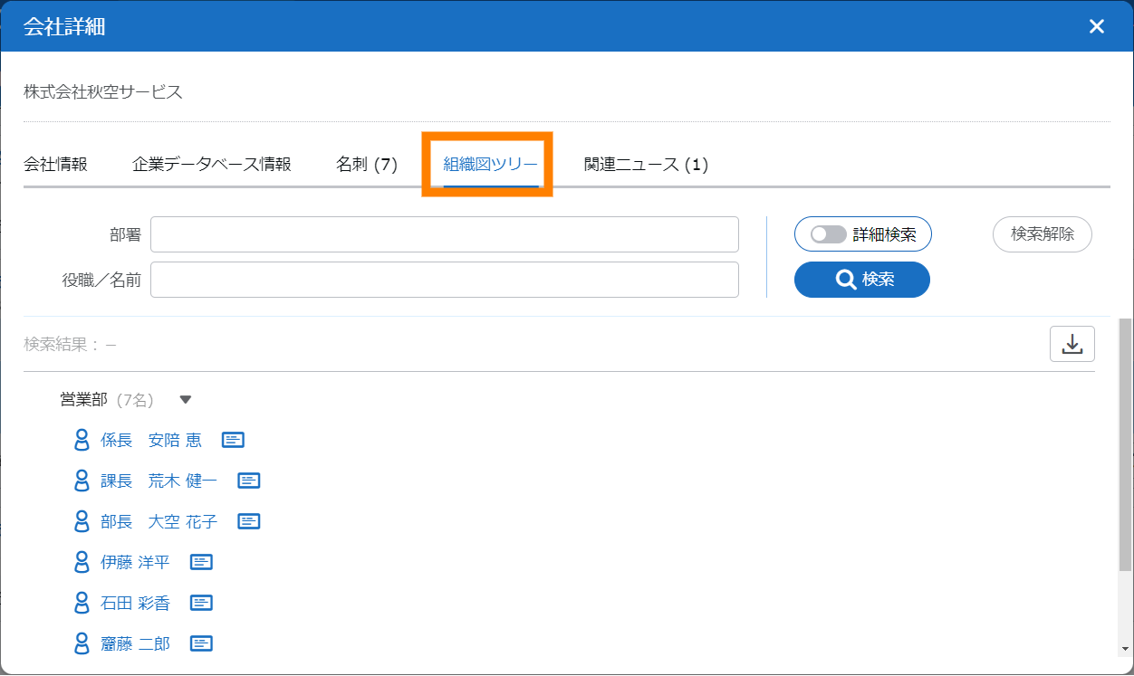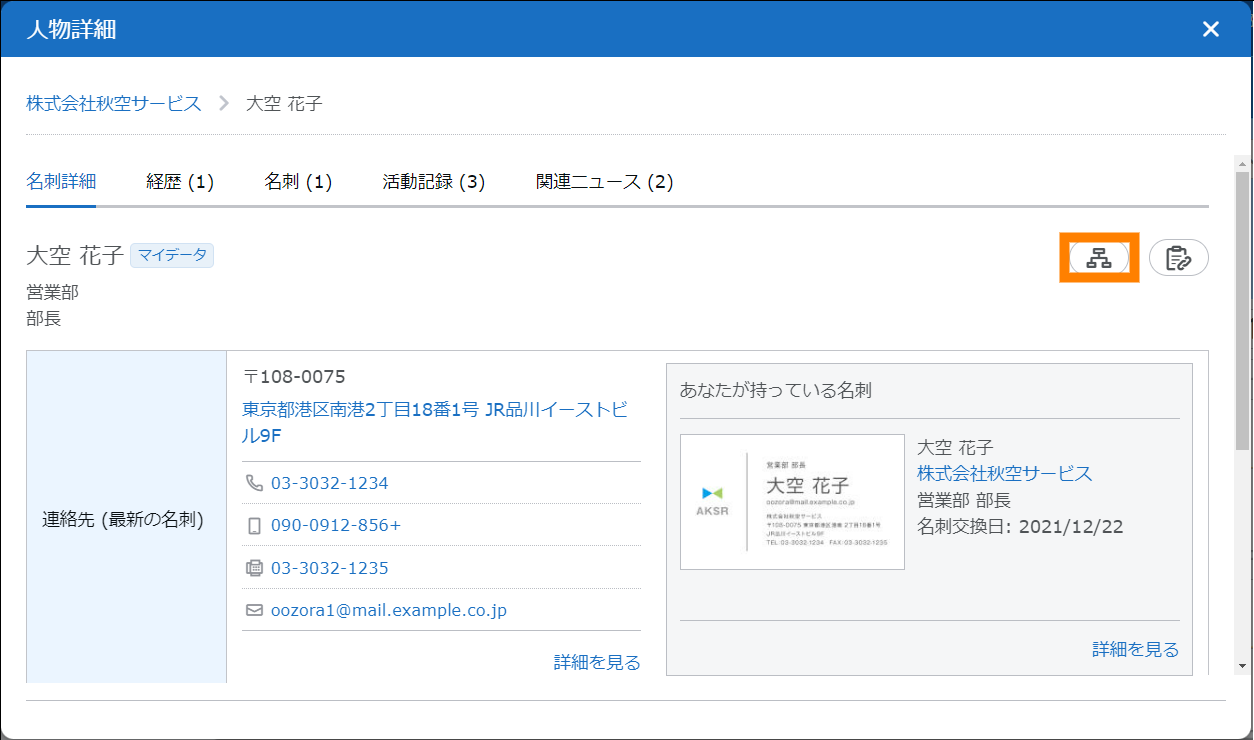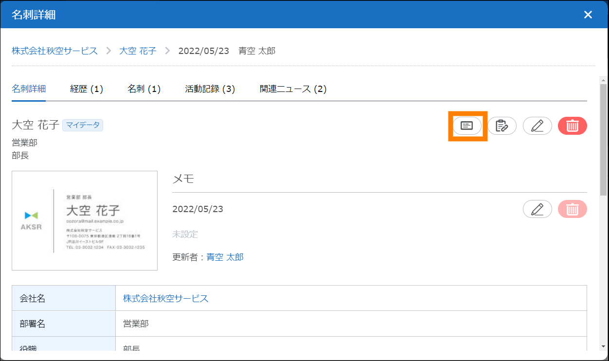 - 画面上部の「名刺」をクリックすると、会社情報と紐づいた名刺情報が確認できます。詳しくは、「3.2.1.1. 名刺情報を検索・閲覧する」を参照してください。