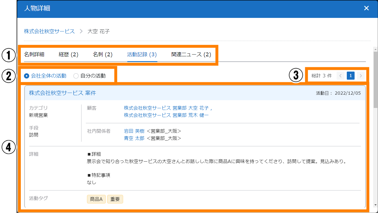 | ④ | 同一人物の名寄せ | 名刺情報から名寄せができます。 | 参照 |