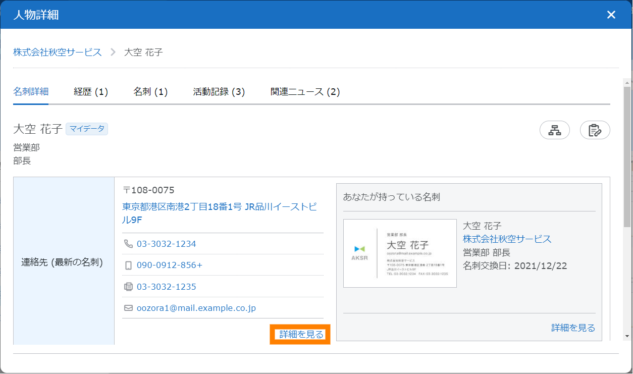 「氏名」をクリックすると、「人物詳細」で「名刺詳細」を選択した場合の画面が表示されます。詳しくは、「■「人物詳細」画面について」を参照してください。
